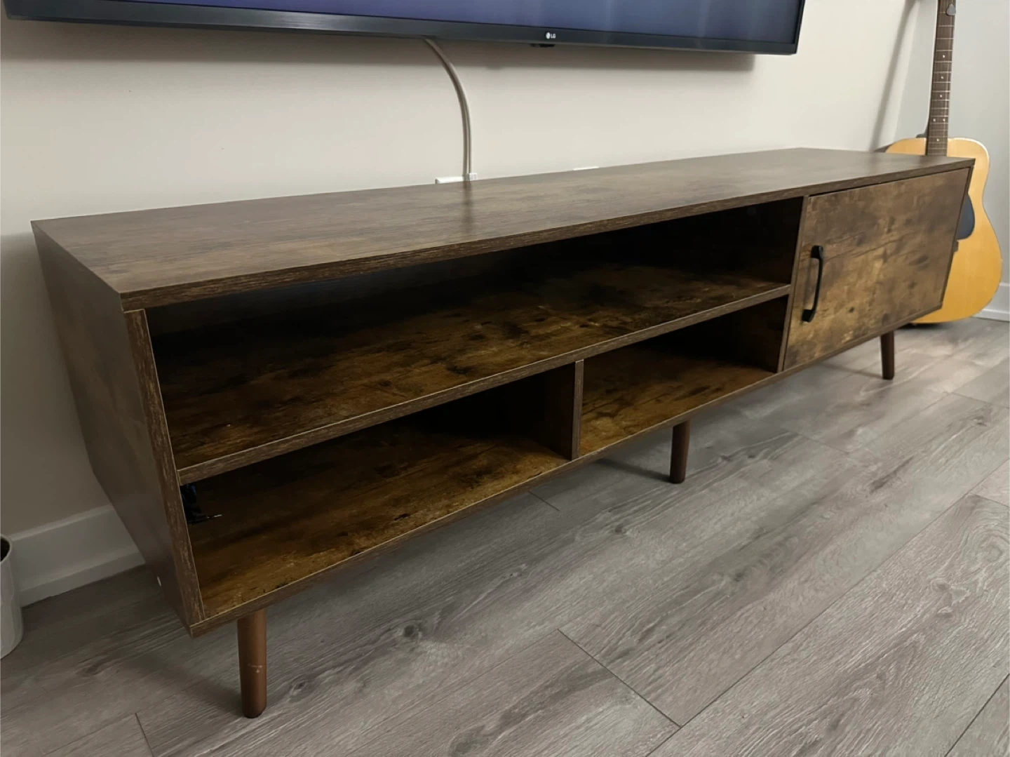 This TV stand offers a dark wood finish with a mid-century modern design. It features open shelving and a cabinet for storage. It's built to hold your media components and more.
