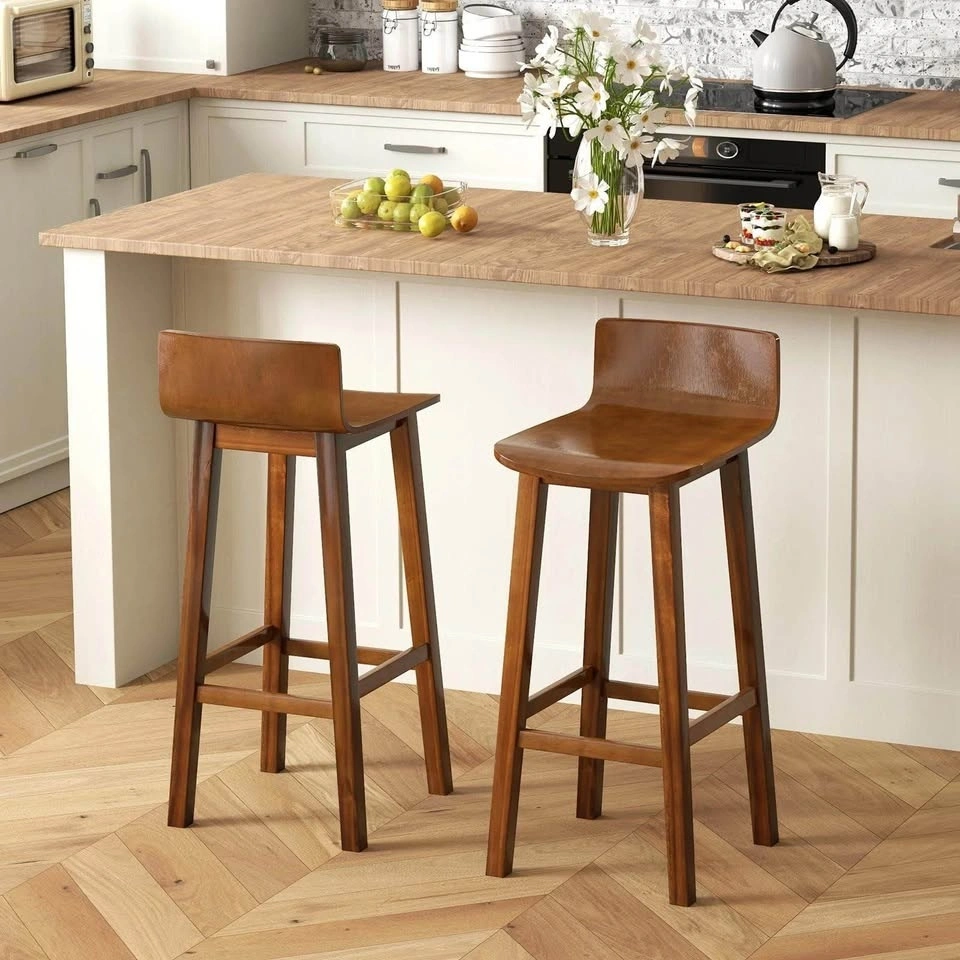 COSTWAY Solid Wood Bar Stools, 29-inch Counter Height Chairs with Low Back and Footrest. Farmhouse style, armless wooden barstools, great for kitchen islands, dining rooms, cafes, or breakfast nooks. Brown color.
