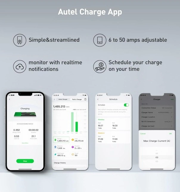 Autel Maxi Charger AC Home, developed by a team of designers and engineers. Offers up to 50A charging, adding about 37 miles per charging hour. Includes a durable 25-foot cable. CSA Certified & NEMA Type 4 rated for all-weather protection (snow, rain, hail, sleet). Suitable for indoor or outdoor use. Features fire resistance, over current, over voltage, and over temperature protection. Control your charger with the Autel Charge APP to manage charge times, schedule charging, and optimize for off-peak electricity. Bluetooth, Wi-Fi, and Ethernet enabled for automatic over-the-air firmware updates. Comes with a 3-year warranty and 24/7 support. Easy for an electrician to install.