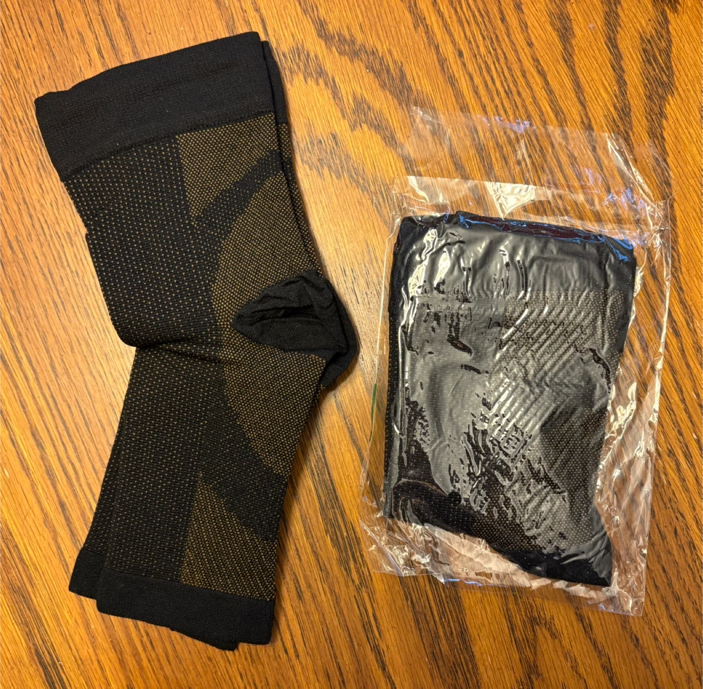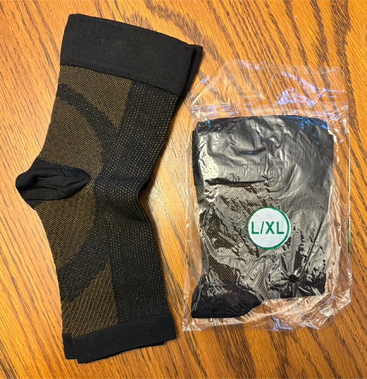 Black compression socks with a textured bronze pattern. These socks are size L/XL. They're designed for comfort and support. Wear them for everyday activities or during exercise. $4 each 😊