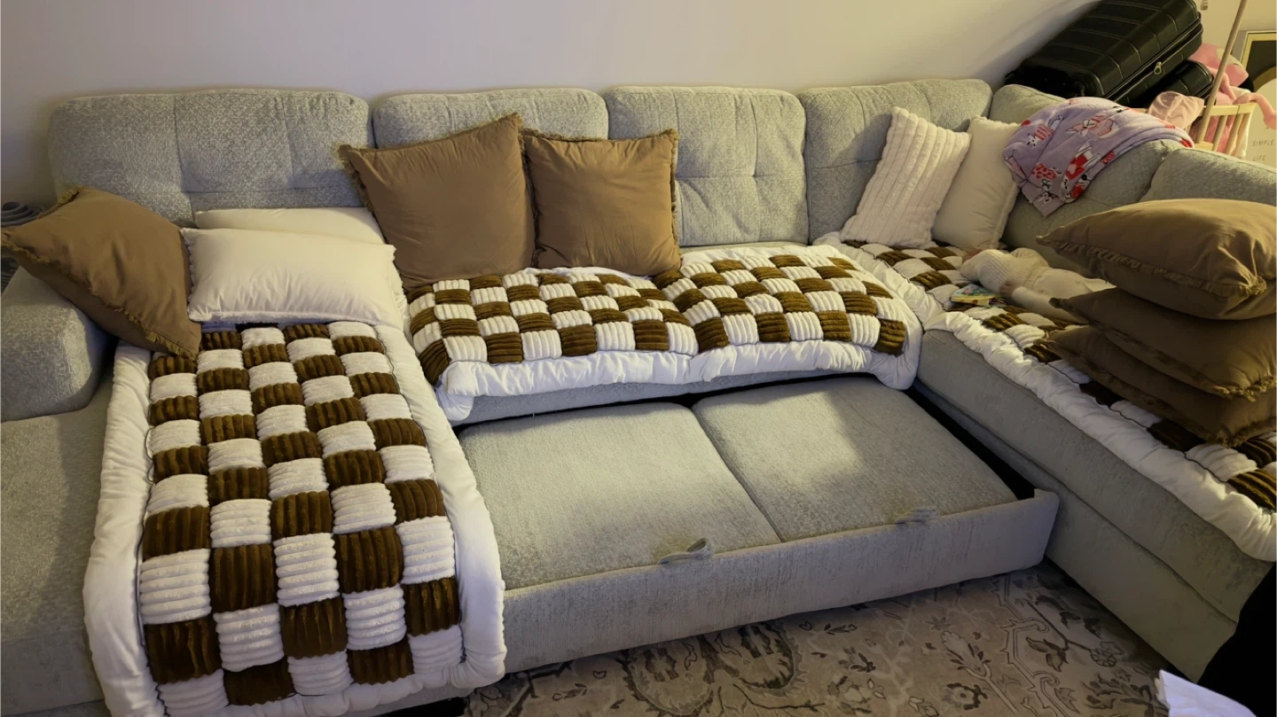 This sectional sofa features a pop-up sleeper function. Upholstered in a light gray textured fabric. It's designed with tufted back cushions and includes accent pillows.