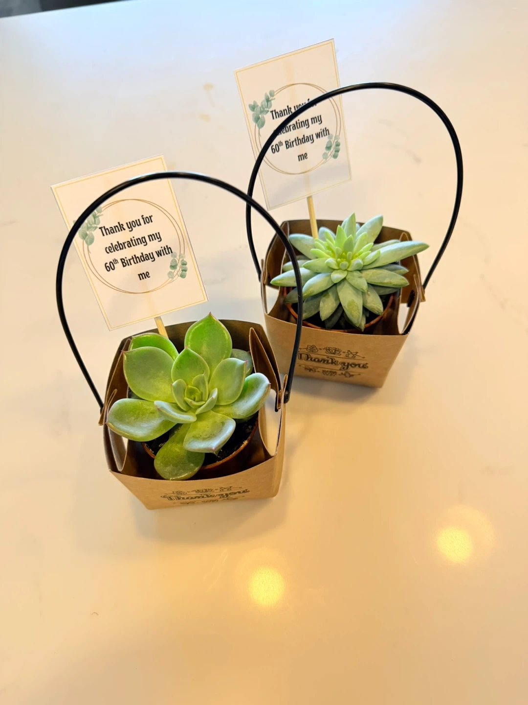 These beautiful succulents in a paper bag makes nice thank you gifts for guests for any party .Price $5 each and extra $$ for customized tags .Please DM me for more information if interested