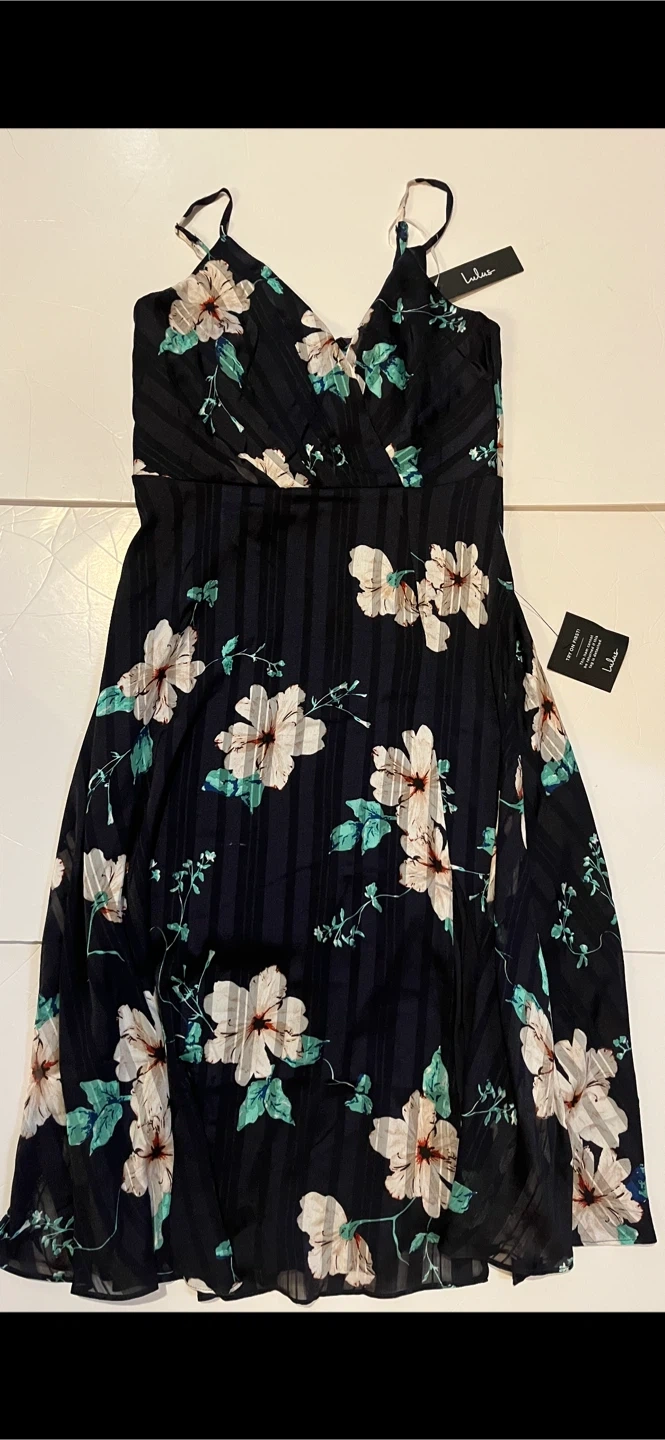 Black floral print wrap midi dress with adjustable straps. Lightweight fabric with a subtle striped texture. Features a flattering V-neckline and a flowy skirt.