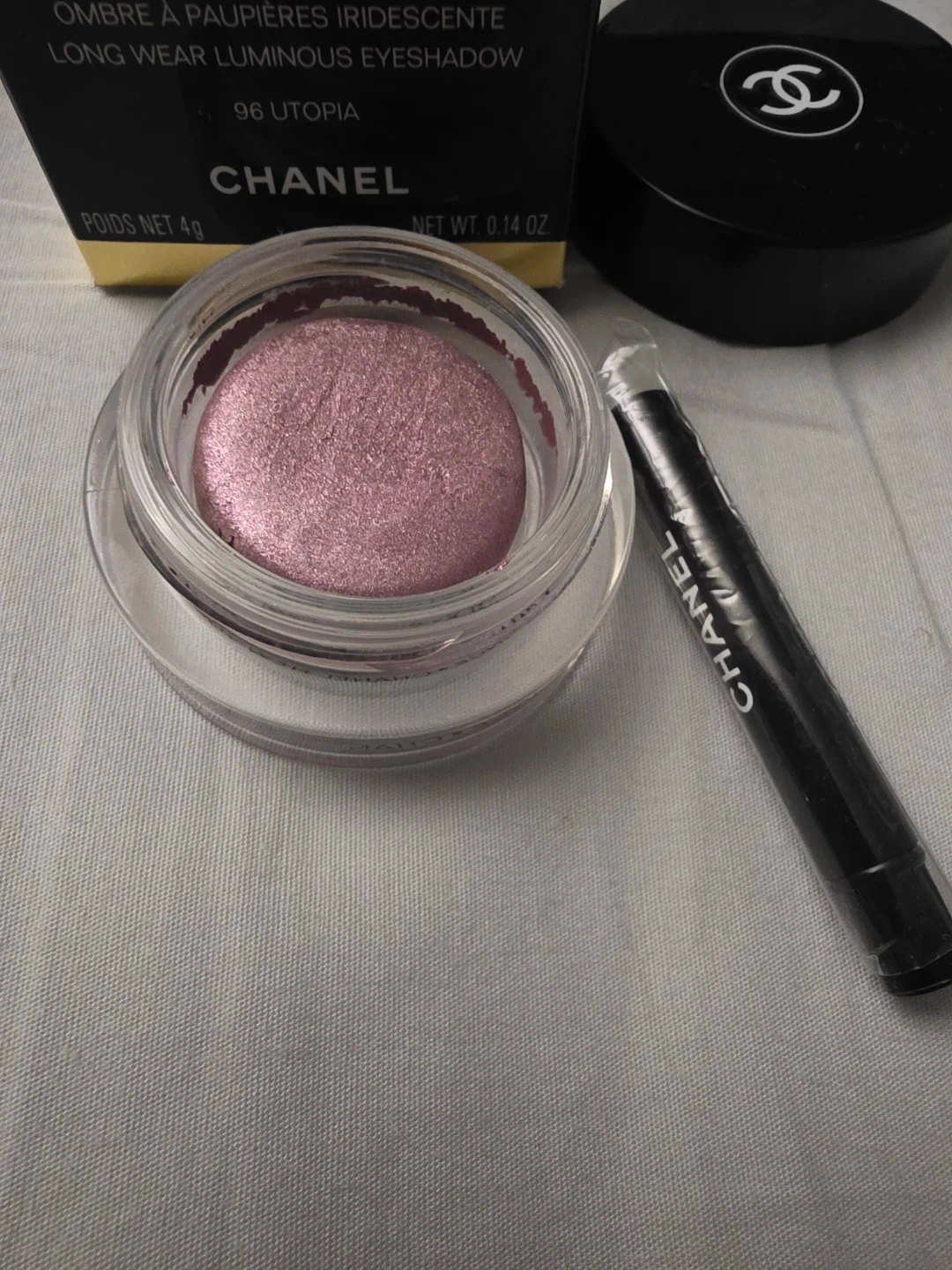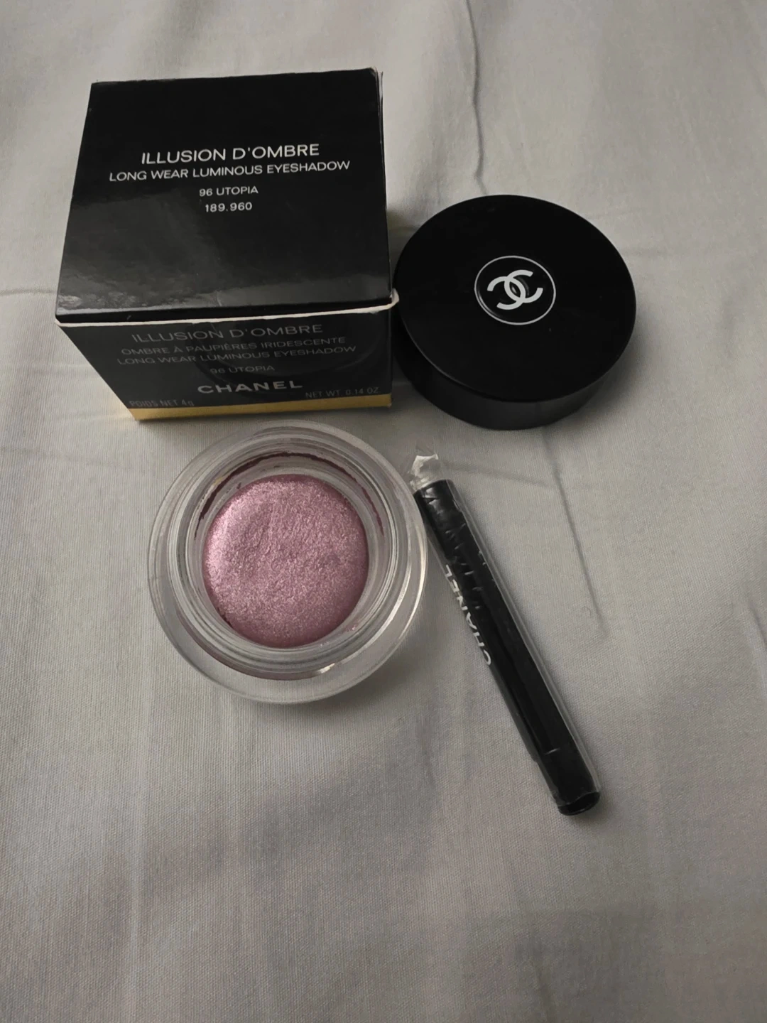 Chanel Illusion d'Ombre is a long-wear luminous eyeshadow in shade 96 Utopia. It's a pot of shimmering eyeshadow with a doe-foot applicator. Net weight is 0.14 oz.