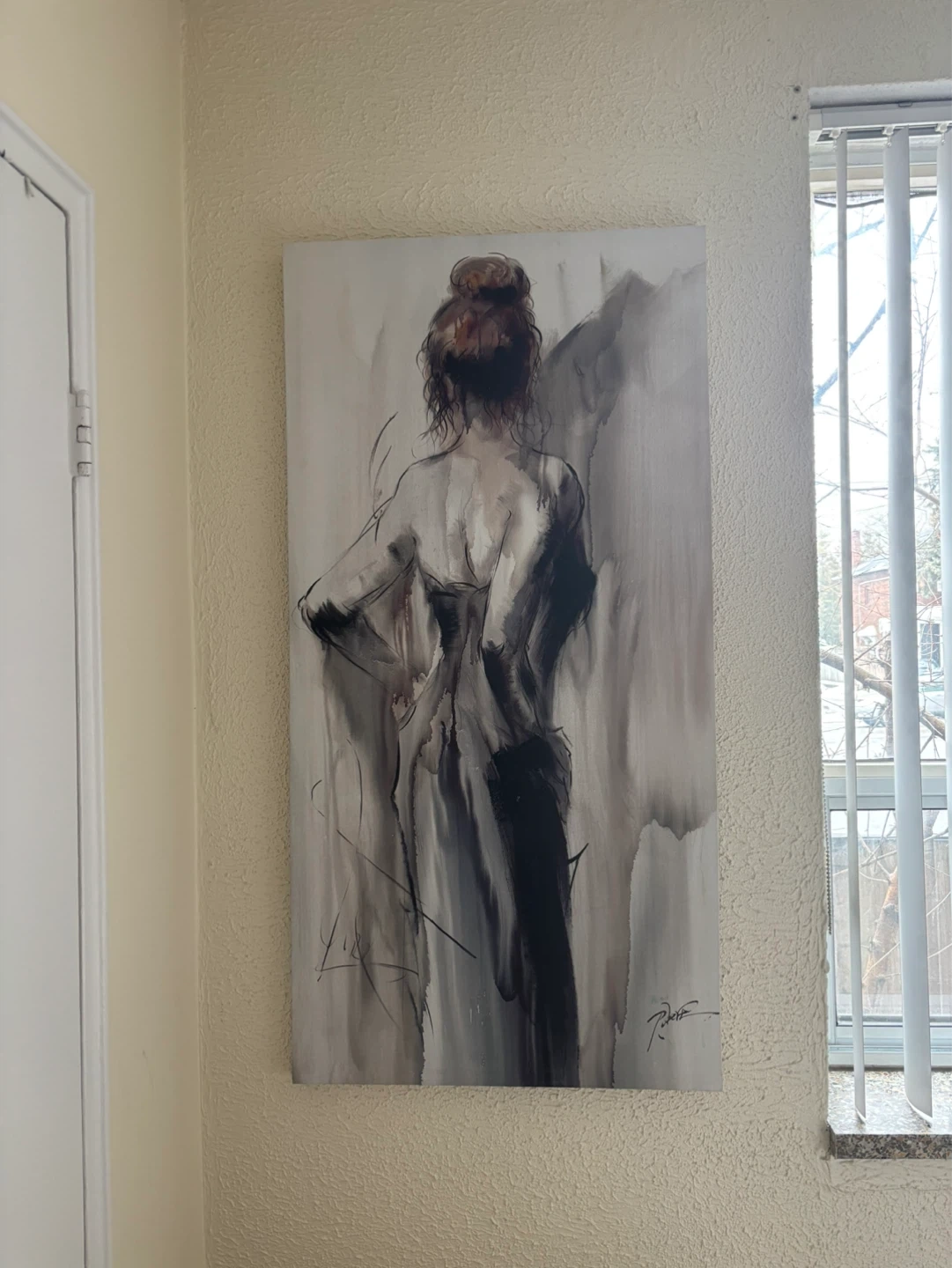 This is a large canvas print featuring an abstract depiction of a woman. The art has a modern, painterly style with a monochromatic colour scheme. It's ready to hang and would make a striking addition to any room's decor. Perfect for adding a touch of elegance to your living space!