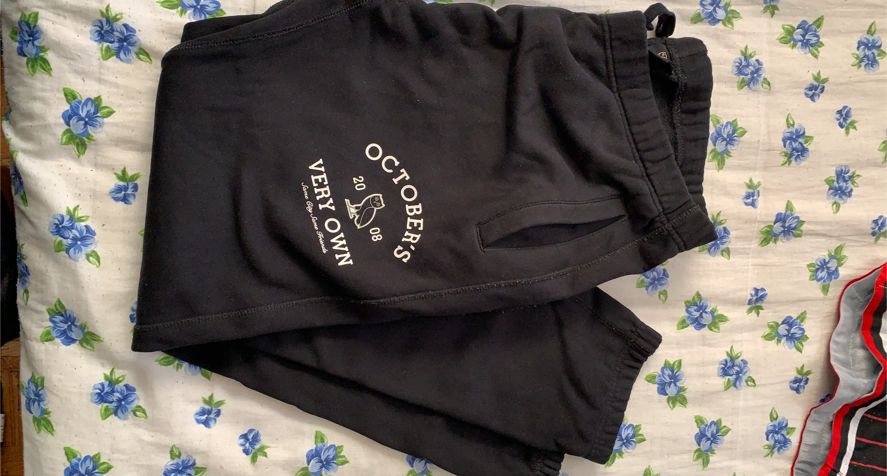 Black sweatpants from October's Very Own. These sweatpants feature the iconic owl logo and 'Very Own' branding. They're made from a comfortable material suitable for casual wear. Elastic waistband with drawstring.