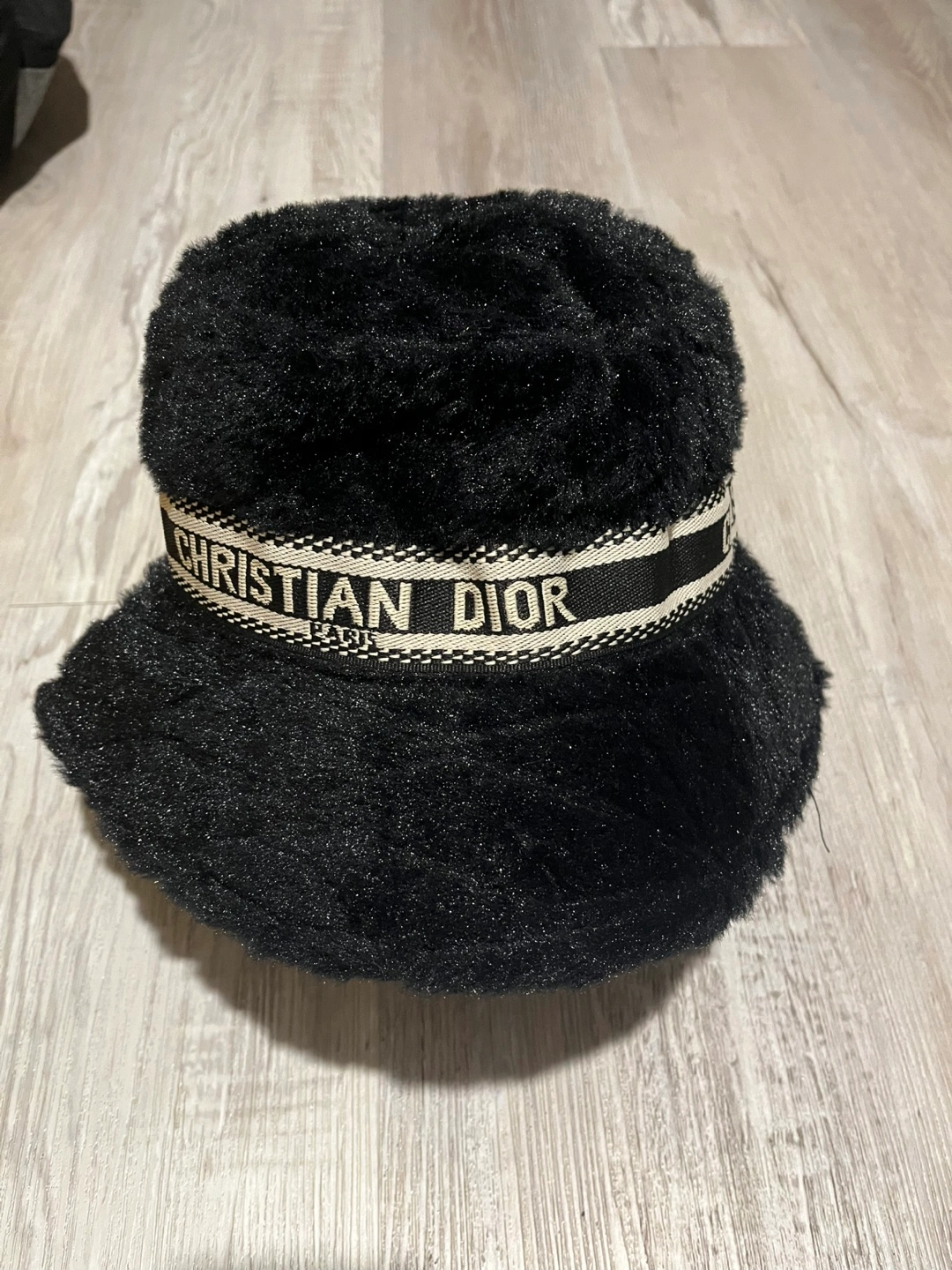 Two Christian Dior bucket hats. One black, one tan. Soft faux fur. Brand label visible. Stylish and warm.