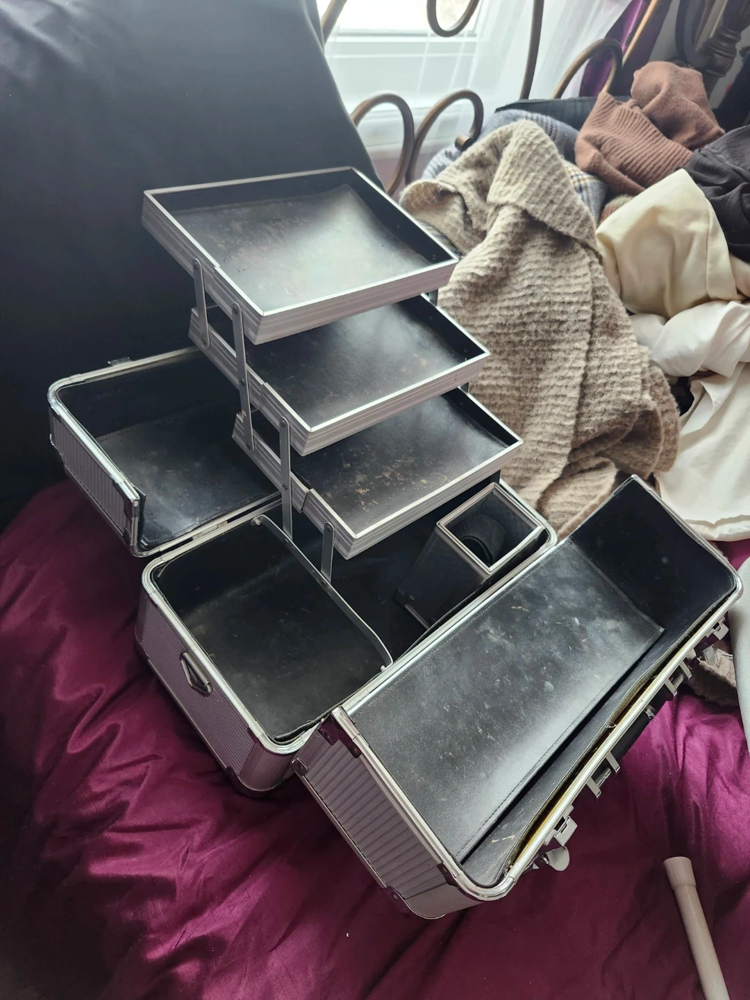 This is a silver aluminium makeup train case with multiple compartments and pull-out trays. It's great for organizing cosmetics and beauty supplies. The case features a sturdy handle and secure latches for travel. $5