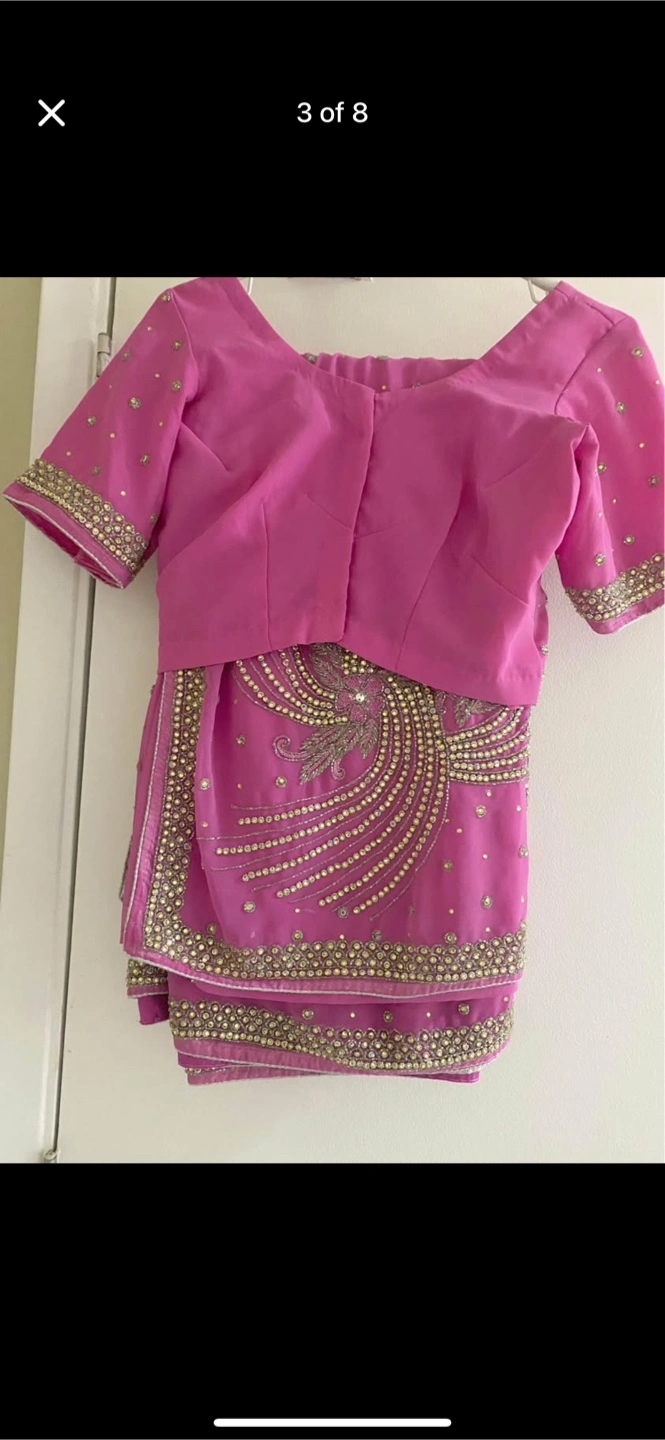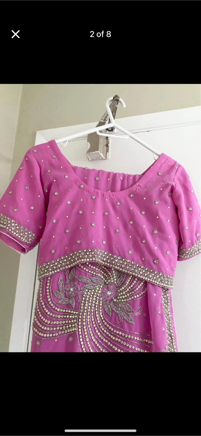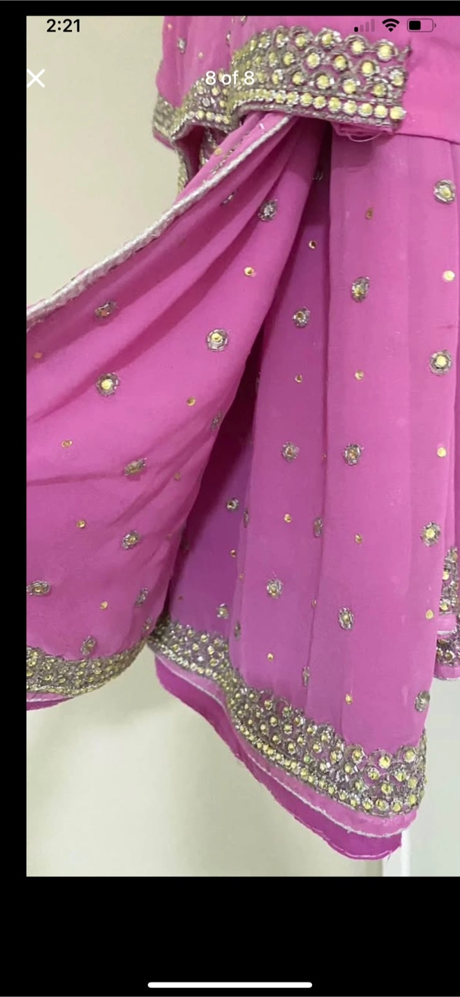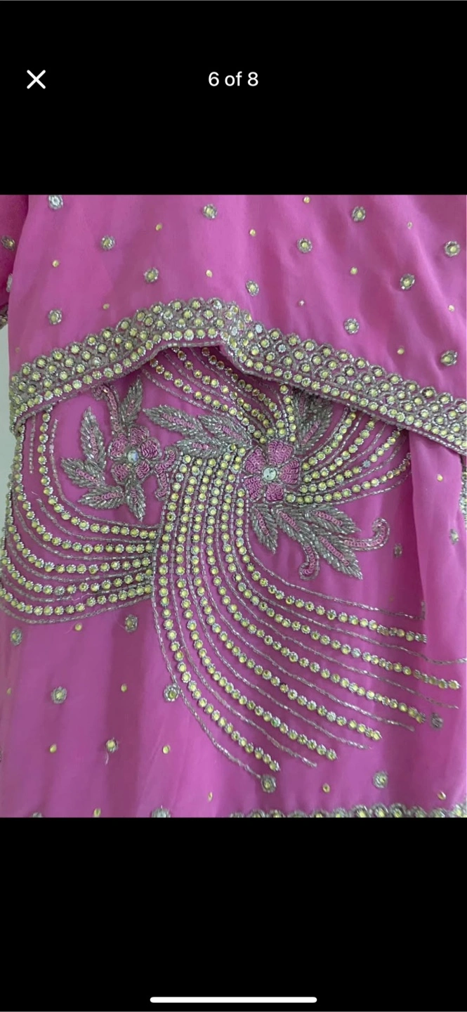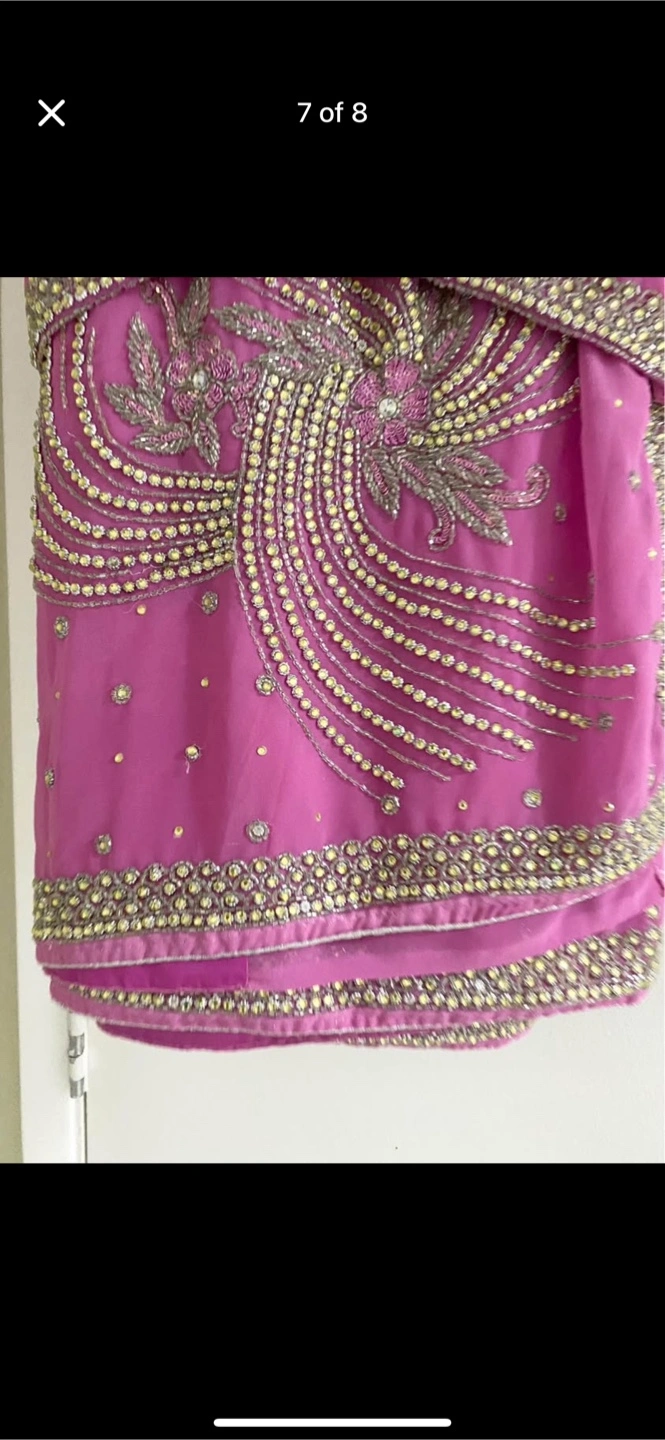 Beautiful pink saree. Intricate gold and silver embellishments. Short sleeves. Suitable for special occasions. Have margin to make medium