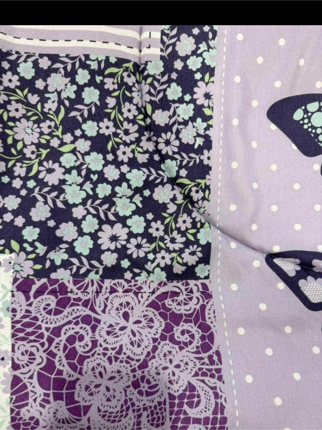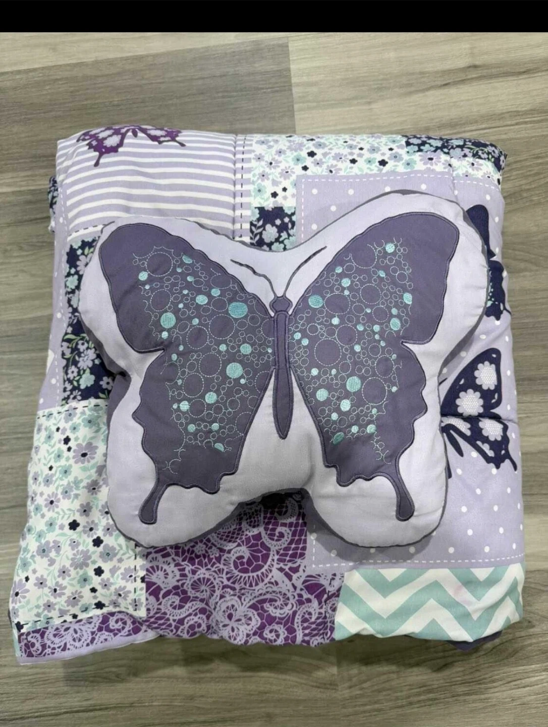 This sweet quilt and pillow set features a charming butterfly design with a patchwork of floral and lace patterns. It's made of soft fabric perfect for a nursery or child's room. It comes with a matching butterfly-shaped pillow.