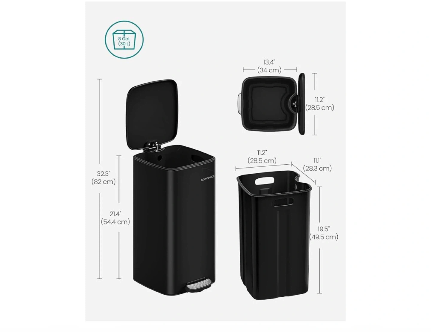 8 gallon (30L) rectangular step trash can in black. It features a soft-close lid and a removable inner bucket for easy cleaning. The compact design fits well in small spaces.