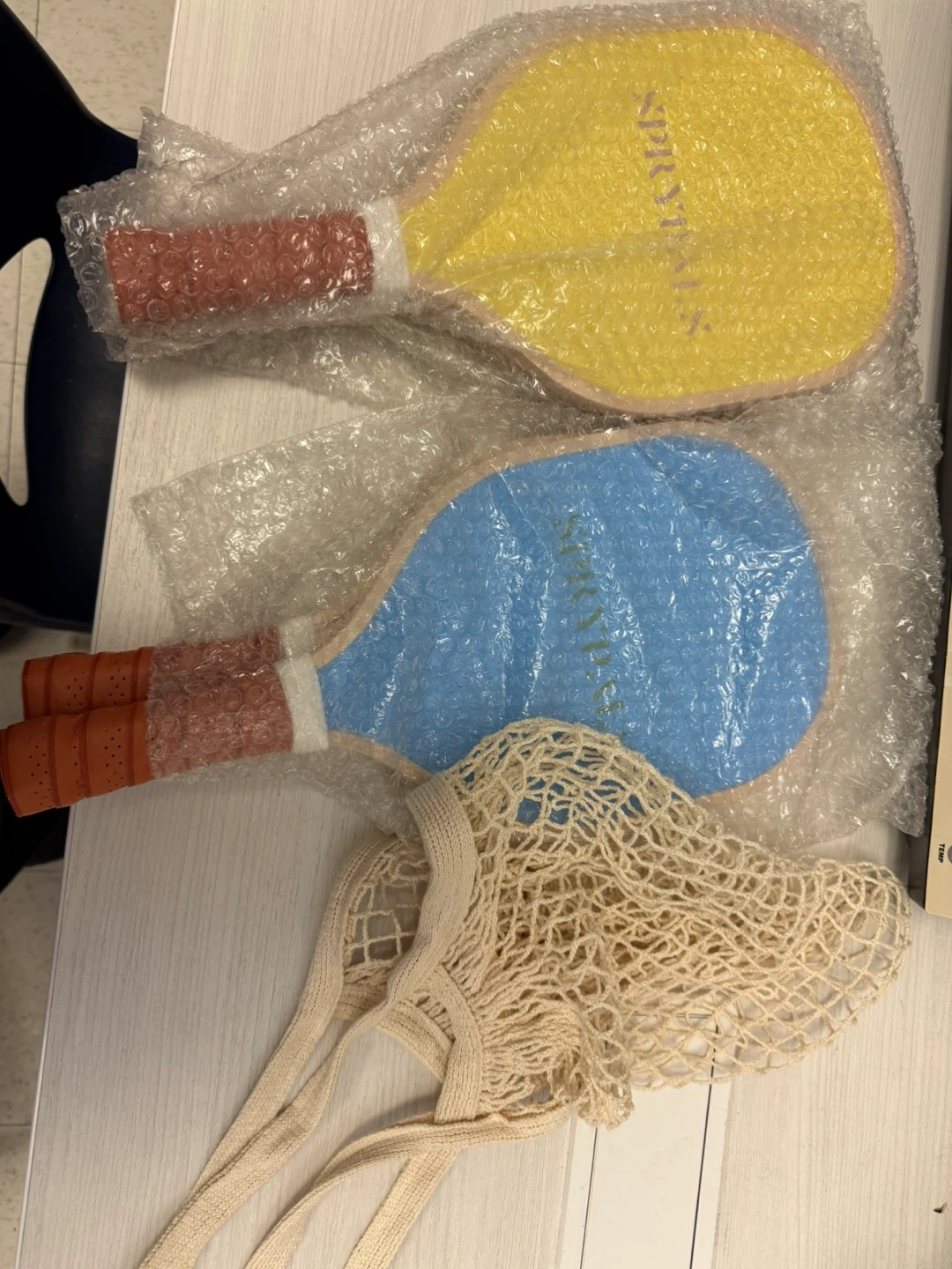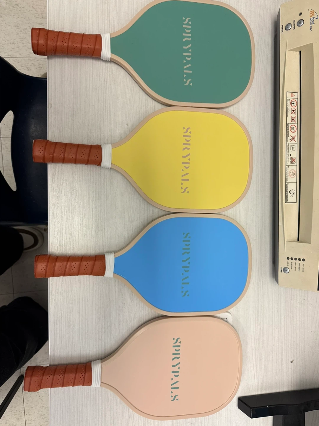 Set of SPRYPALS pickleball paddles. Includes one green, one yellow, one blue, and one pink paddle. Also includes a mesh bag. Paddles feature wood construction with grip handles.