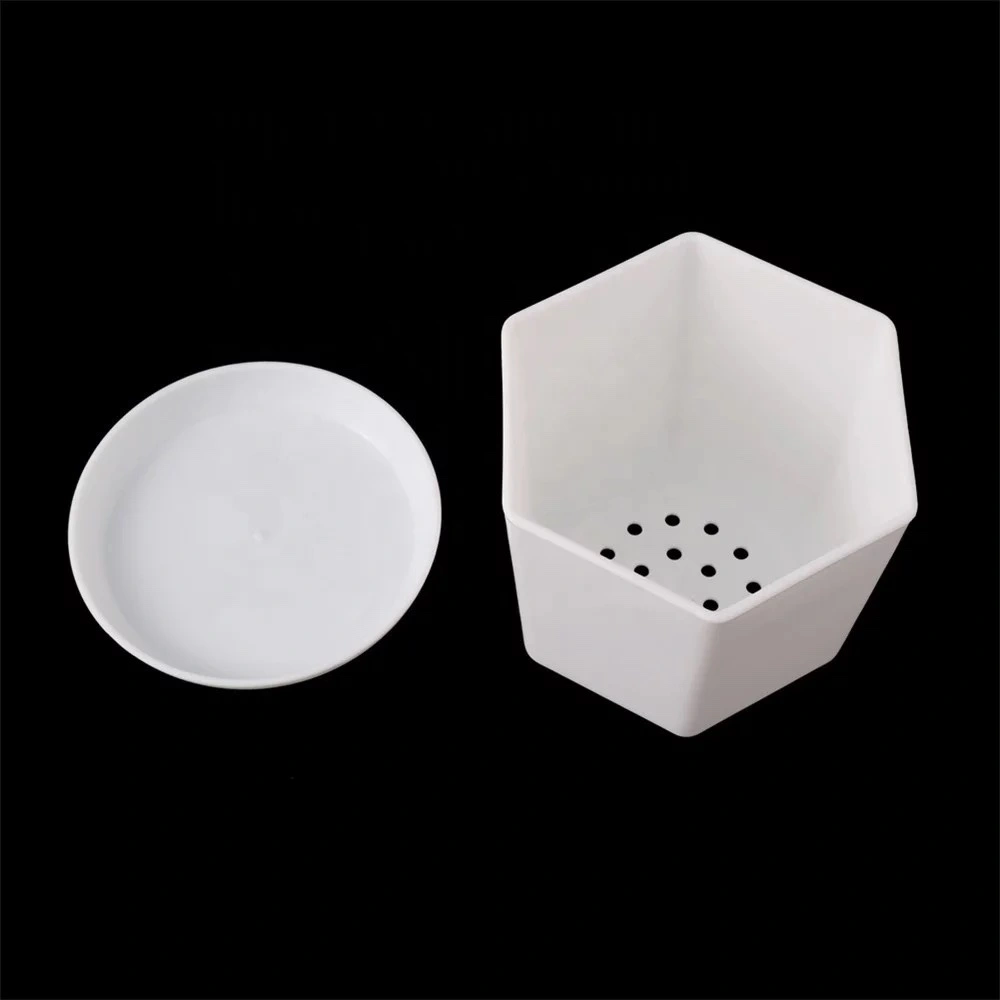 white plastic flower pots with drainage holes and matching saucers. They are great for indoor plants, succulents or herbs.