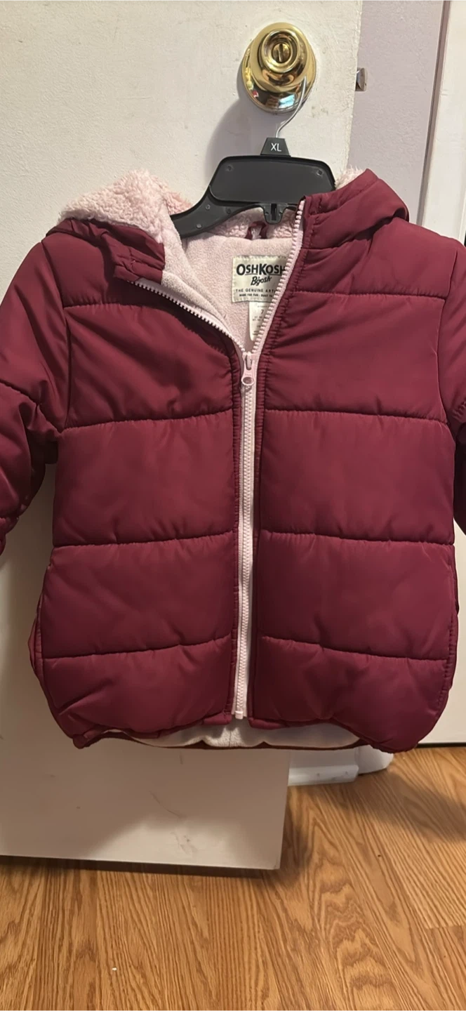 This OshKosh B'gosh puffer jacket is a size 7. It features a cozy sherpa lining inside the hood and body. The exterior is a classic quilted design in a deep red colour.