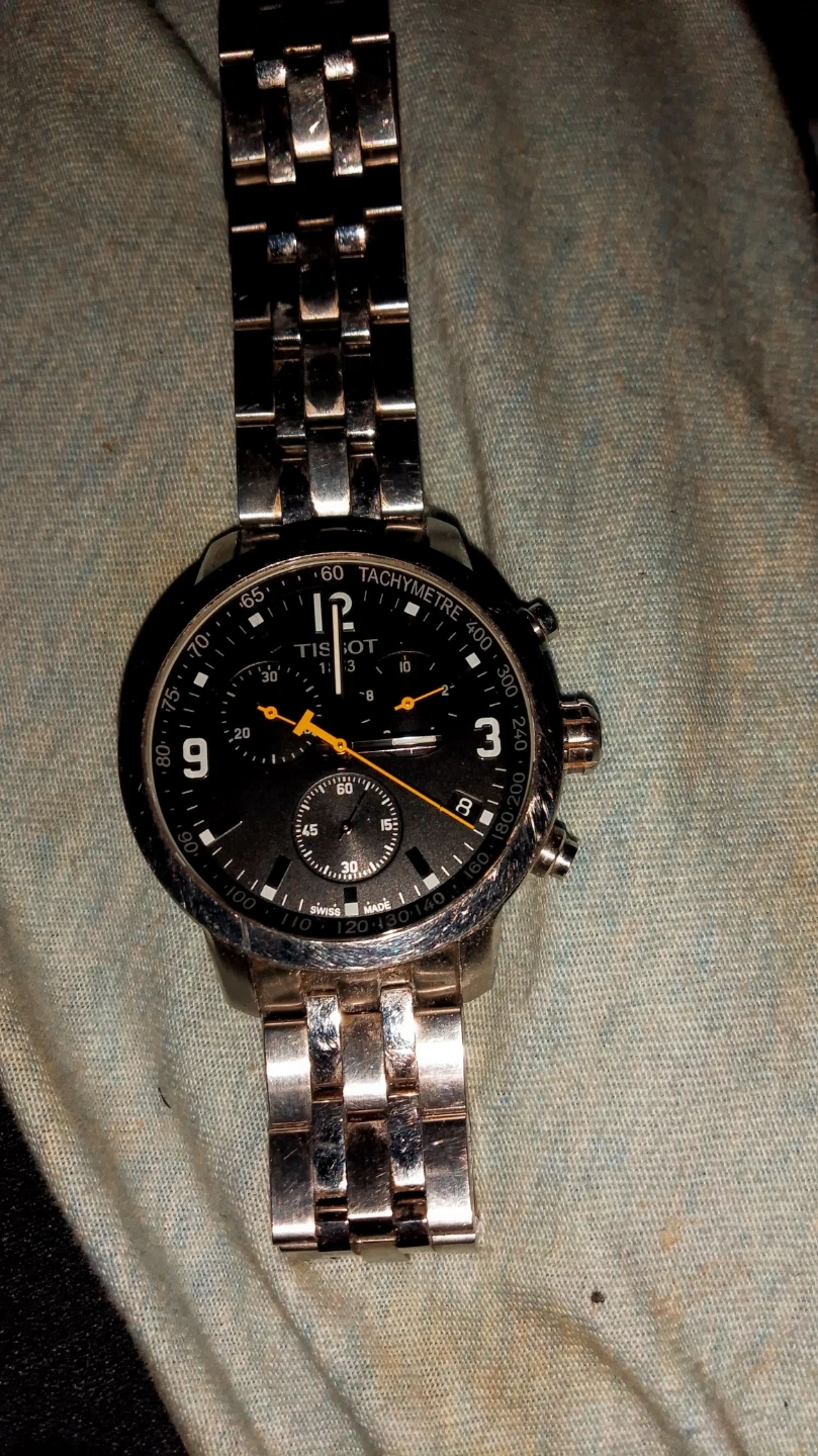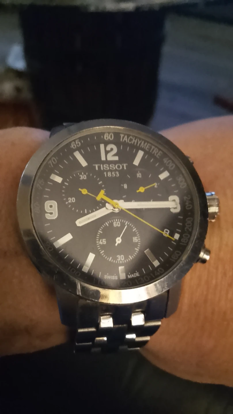 Men's Tissot T-Race Chronograph watch with a black dial and stainless steel band. It features a tachymetre and subdials for precise timekeeping. Swiss made movement.