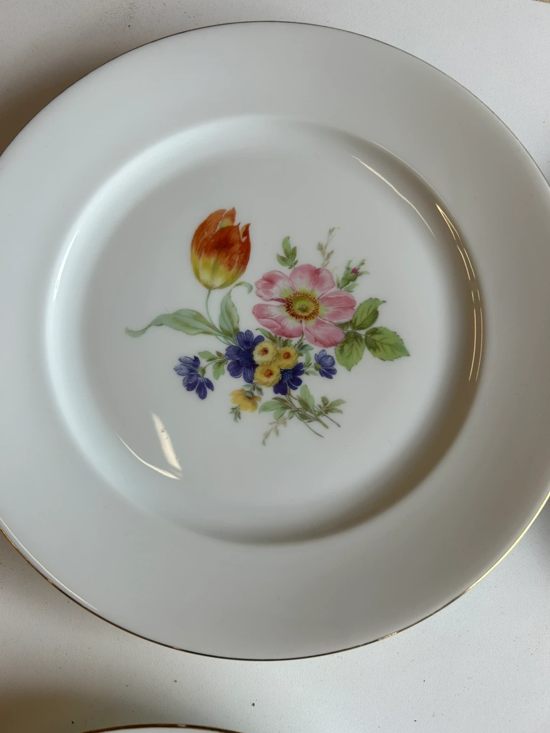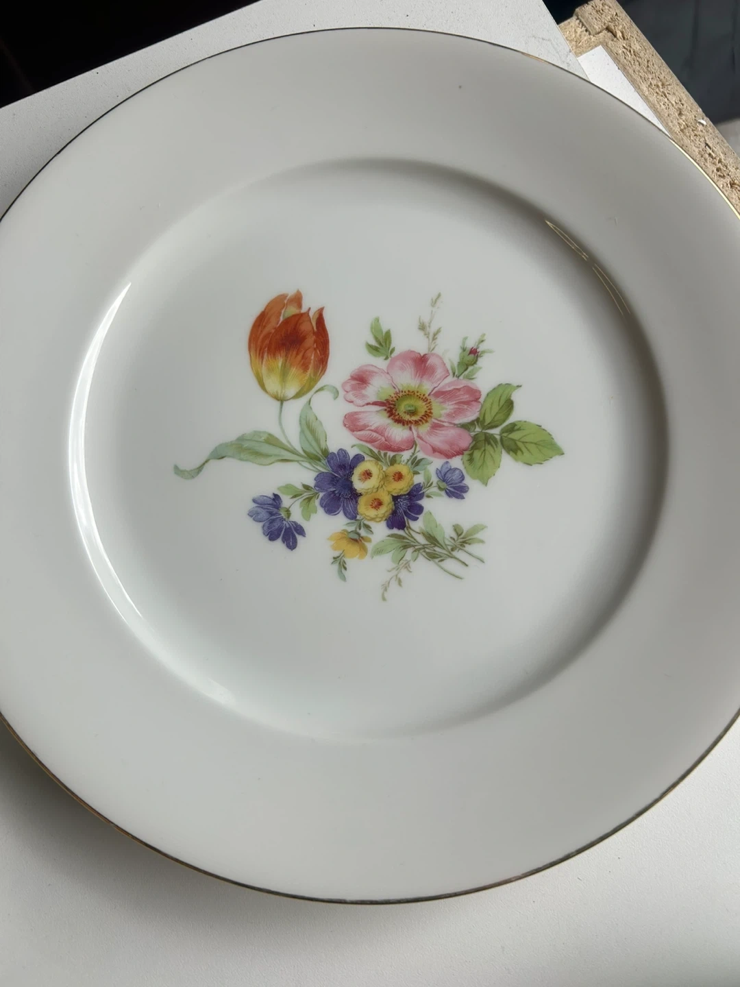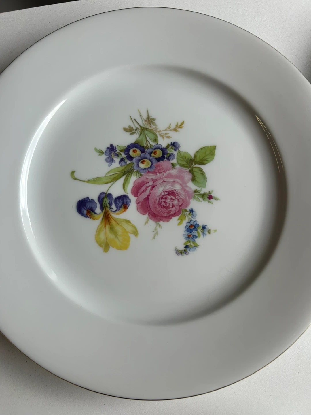 White porcelain plate with a beautiful floral design featuring a tulip, rose, iris, and other small flowers. It has a delicate gold trim around the edge and is marked 'Fabrique en France' and 'Made in France' on the back. This decorative plate would add a touch of elegance to any table setting.