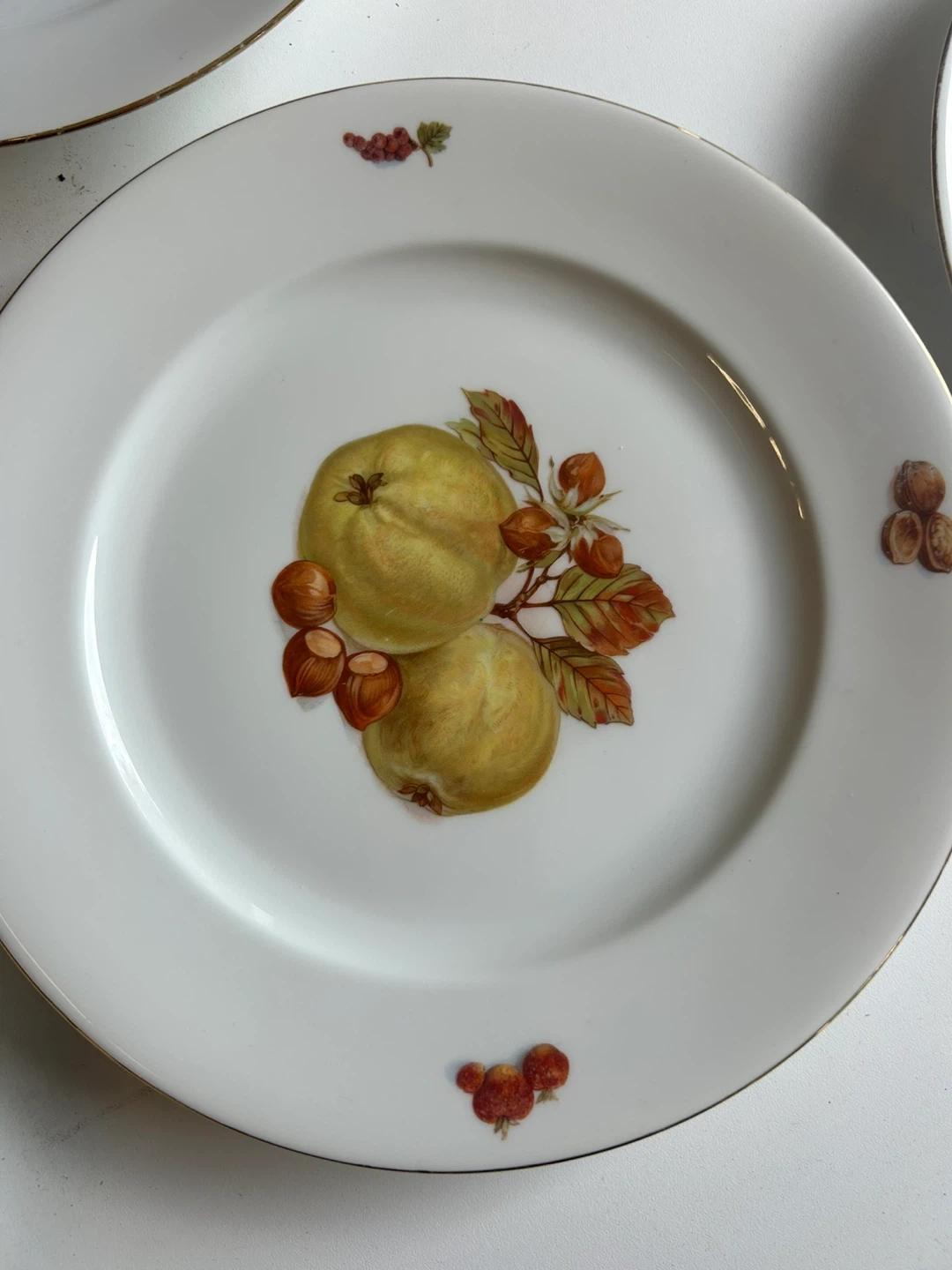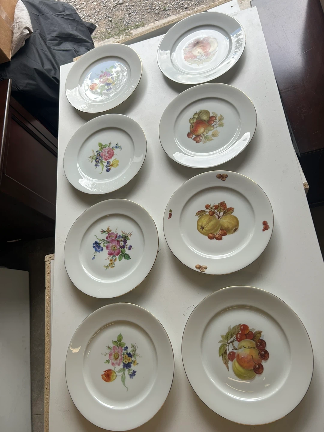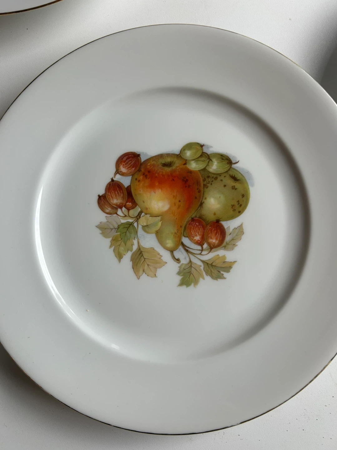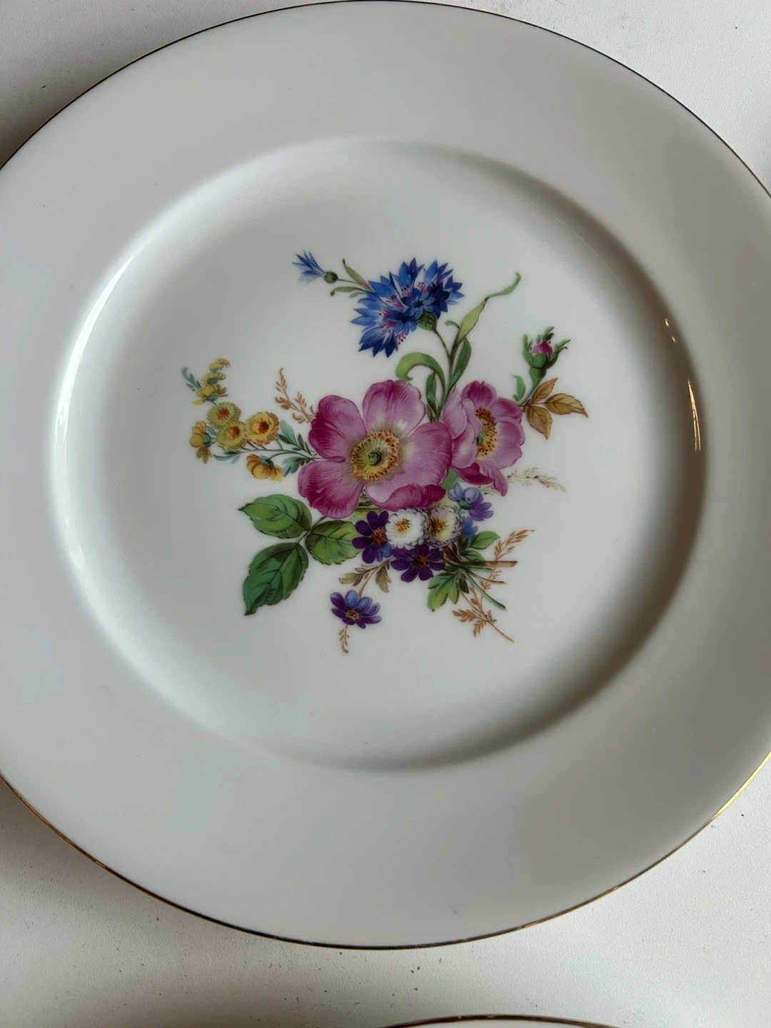 White porcelain plate with a beautiful floral design featuring a tulip, rose, iris, and other small flowers. It has a delicate gold trim around the edge and is marked 'Fabrique en France' and 'Made in France' on the back. This decorative plate would add a touch of elegance to any table setting.