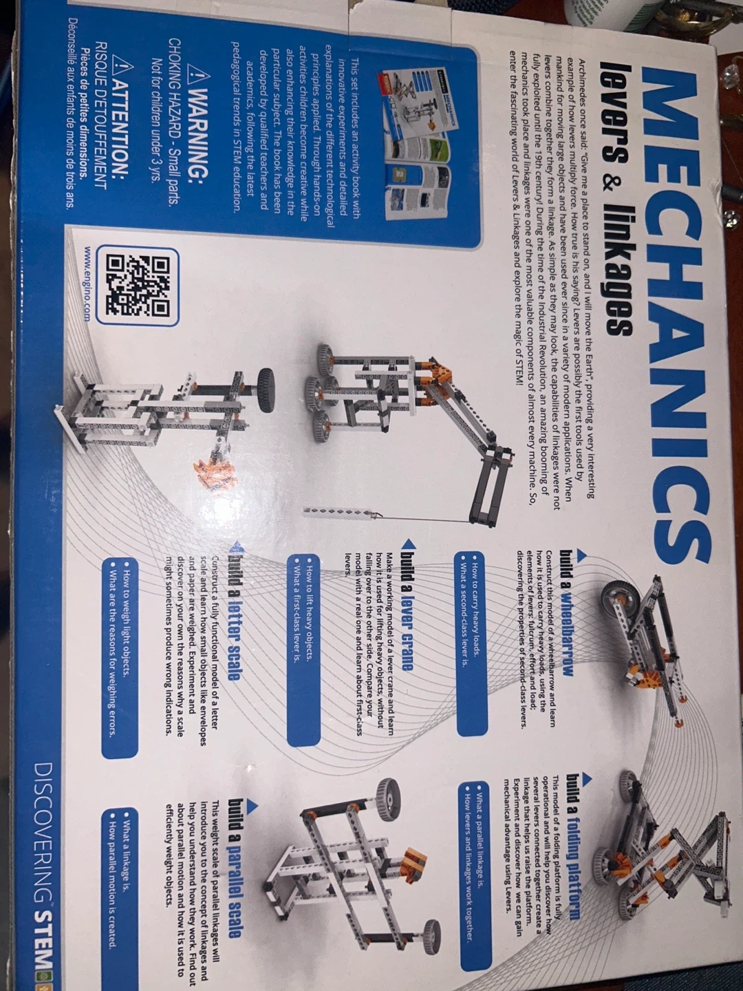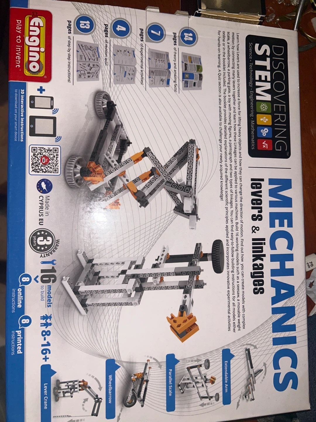 This Engino Discovering STEM Mechanics kit focuses on levers and linkages! It's designed to help kids learn about engineering and mechanics in a hands-on way. The kit includes parts and instructions to build different models, like a lever crane, wheelbarrow, and parallel scale. Suitable for ages 8-16+