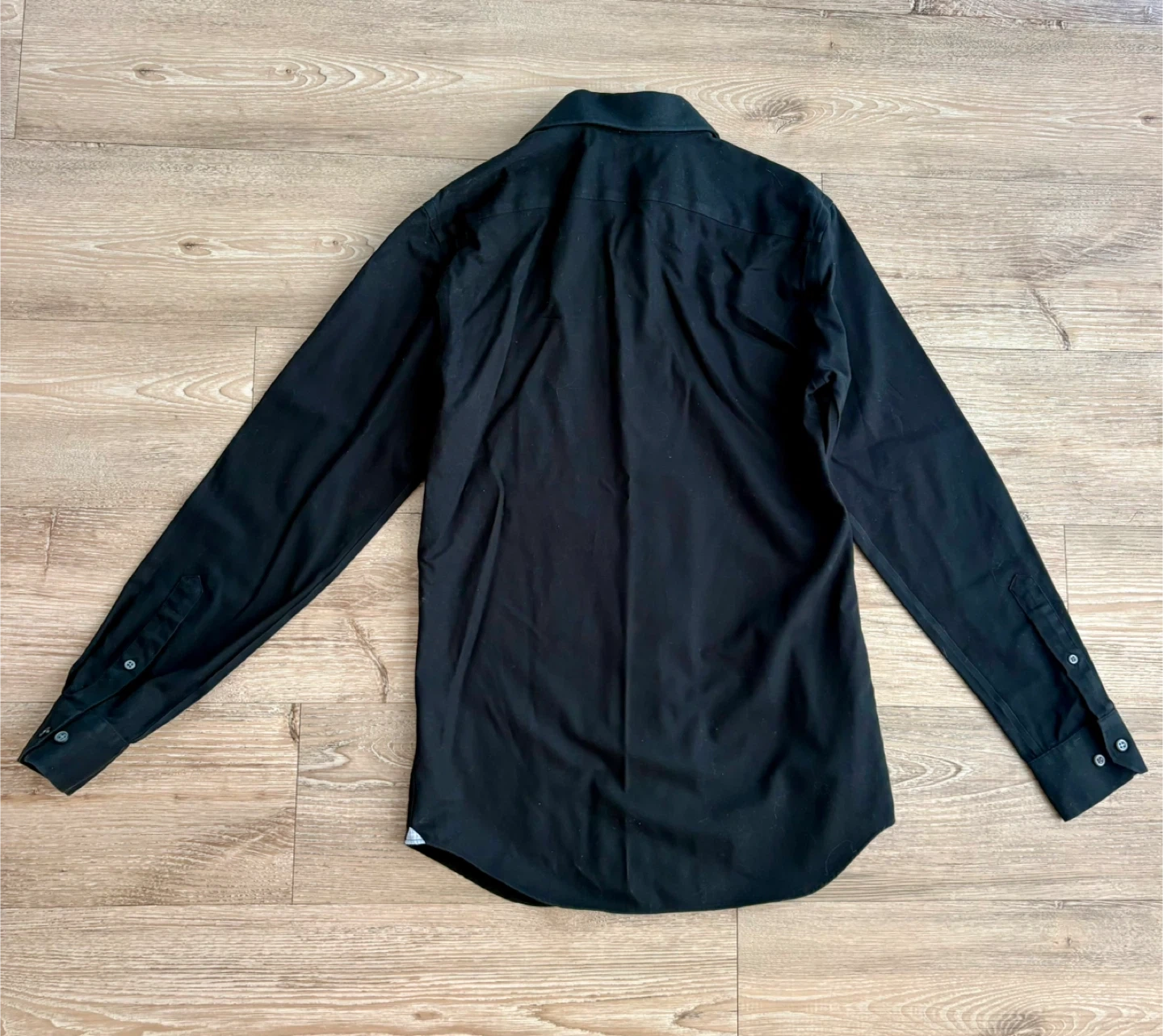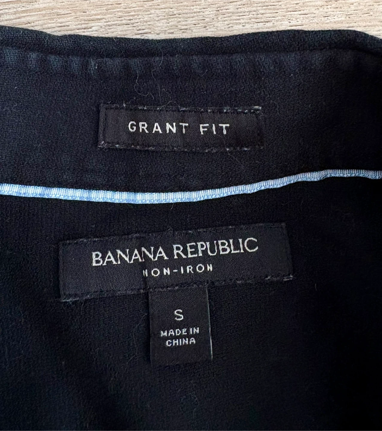 This is a Banana Republic non-iron dress shirt in black. It's a size small with a Grant Fit. Machine washable for easy care!