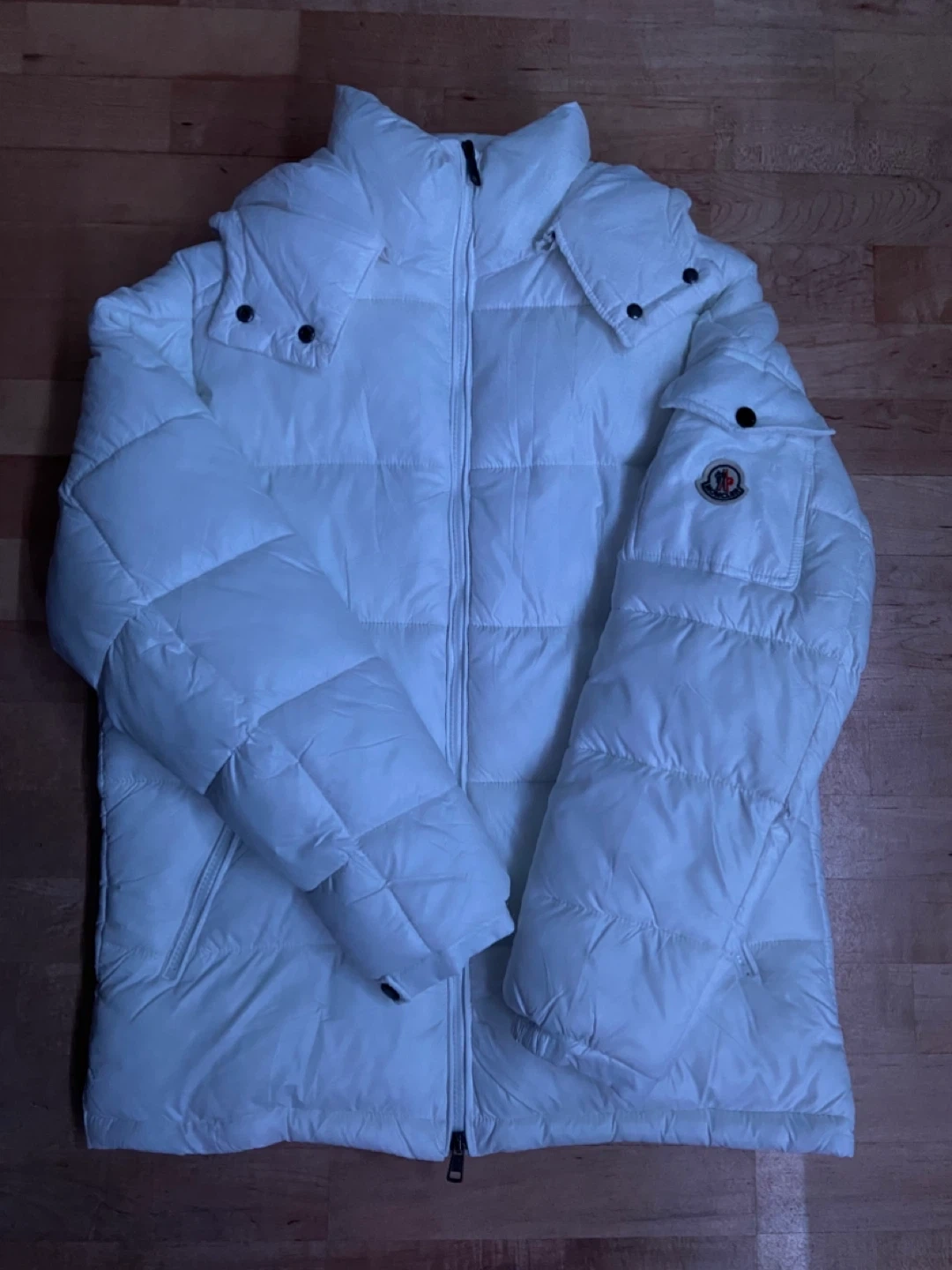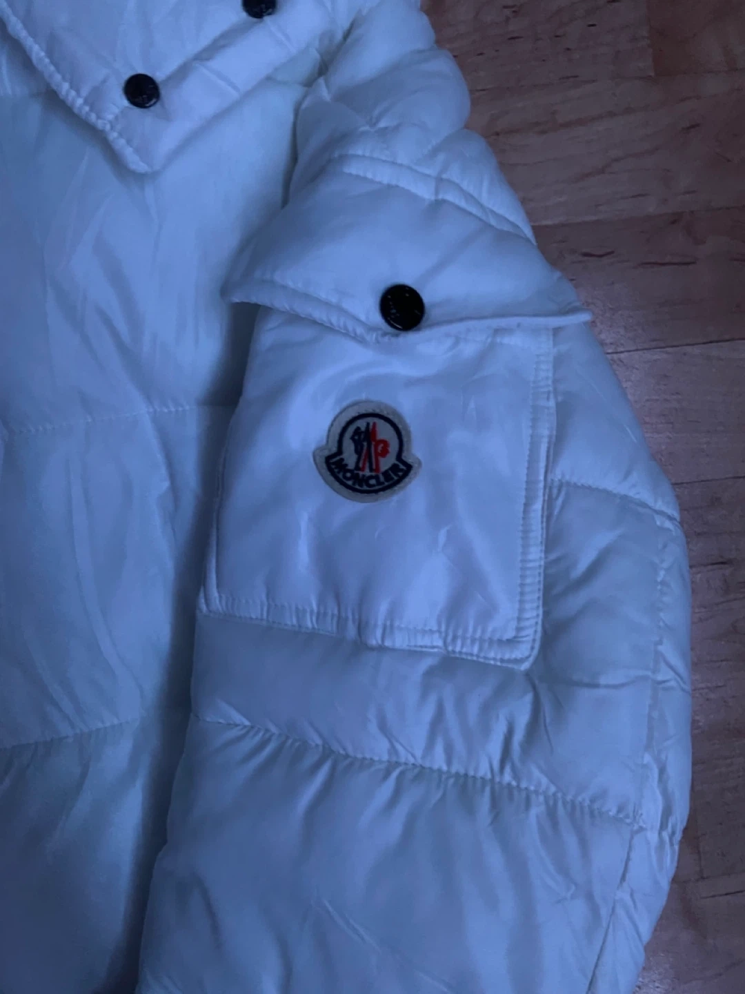 A stylish white puffer jacket from Moncler. It's a durable outerwear piece perfect for cooler weather. Material is down-filled for warmth.