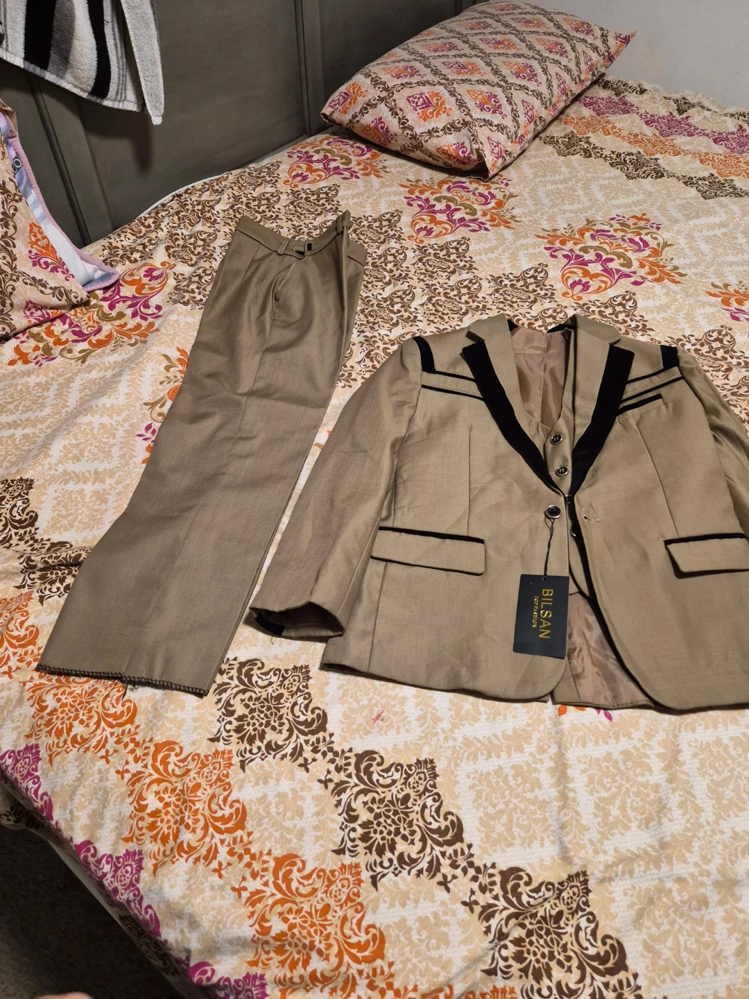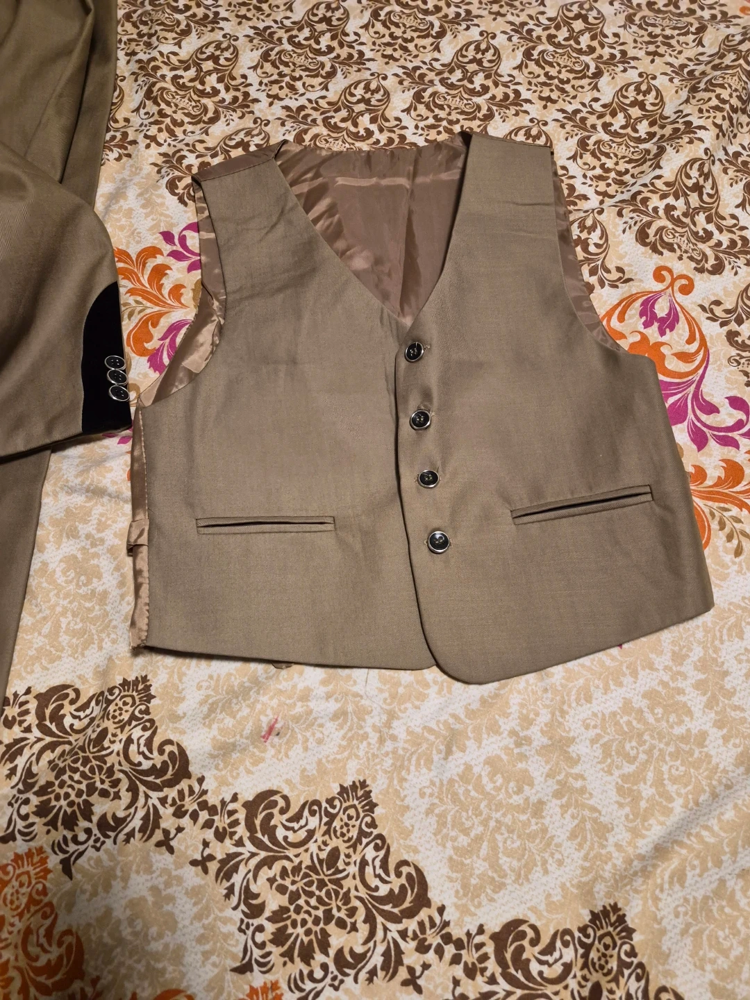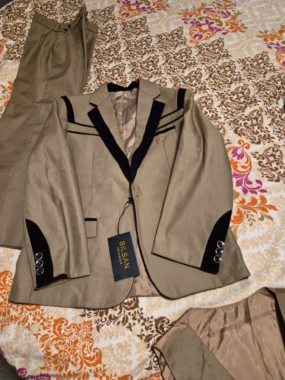 Selling a Bilsan suit set that includes a jacket, pants, and vest. The suit is a stylish tan colour with black accents. Perfect for a formal occasion. Size 22 in kids wear. Brand new. Never weared.