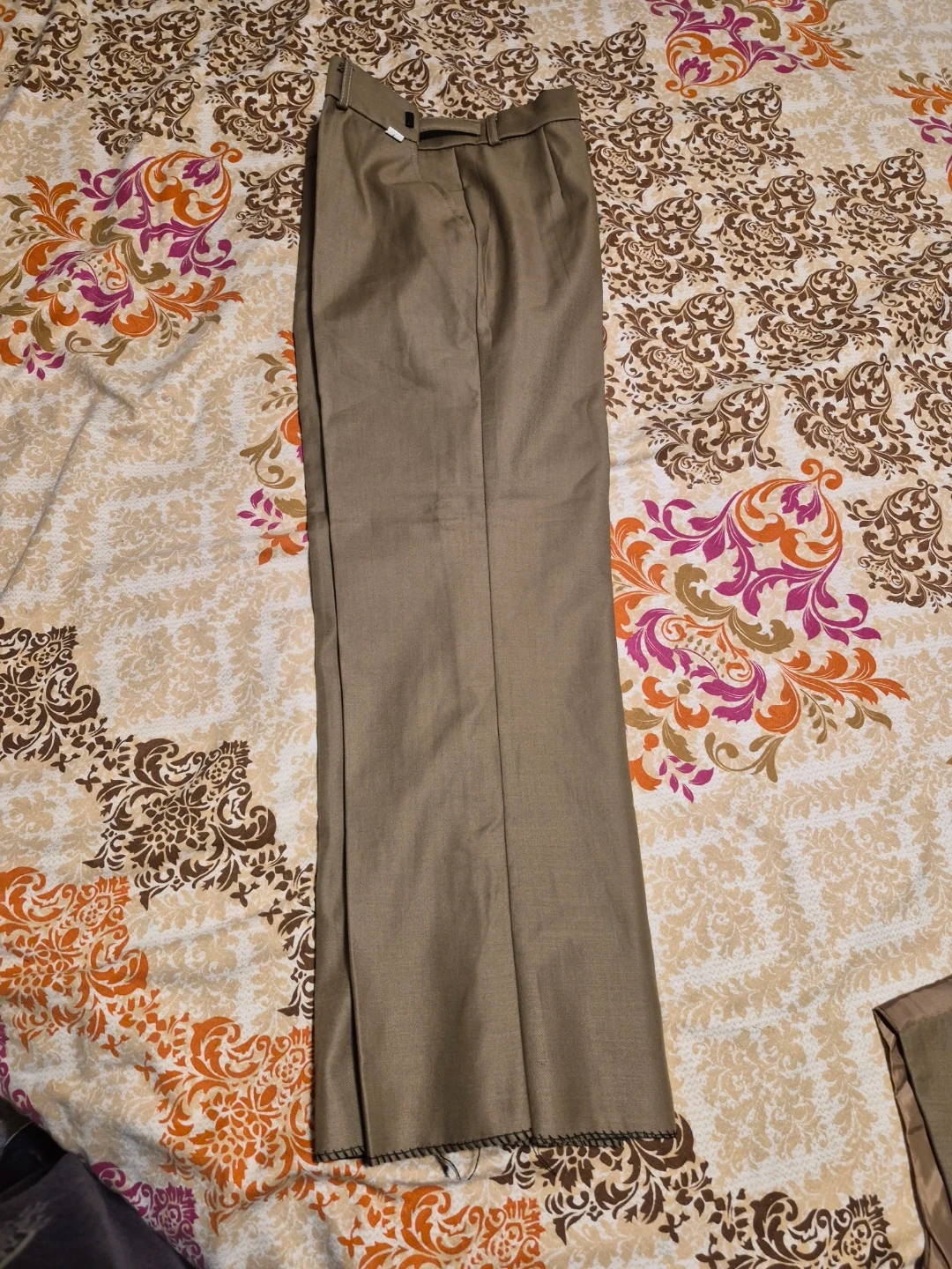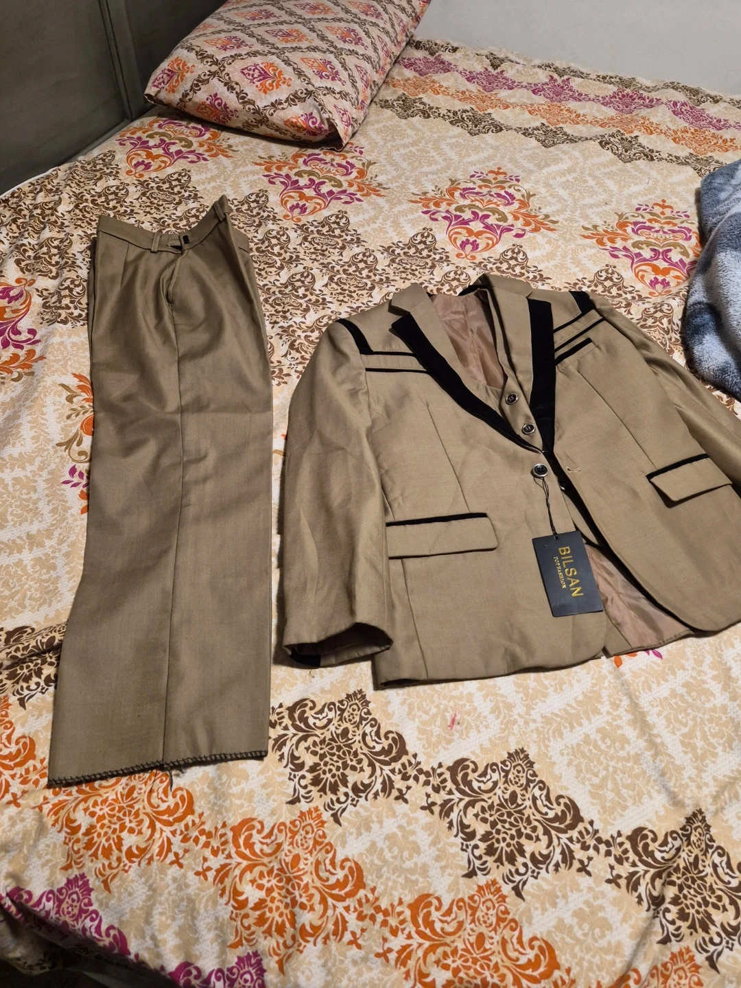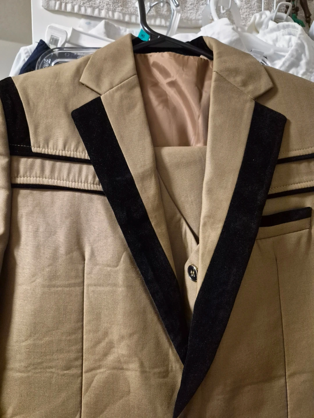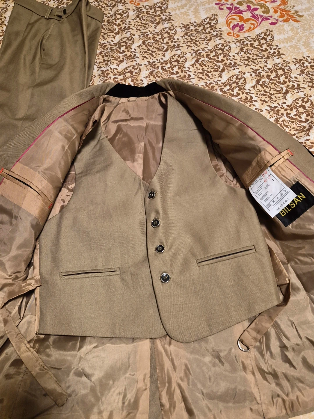 Selling a Bilsan suit set that includes a jacket, pants, and vest. The suit is a stylish tan colour with black accents. Perfect for a formal occasion. Size 22 in kids wear. Brand new. Never weared.