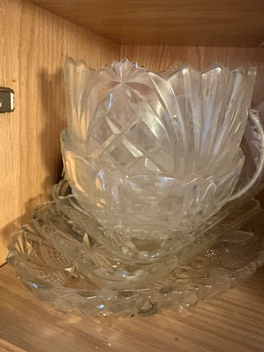 This is a set of clear glass serving bowls with a decorative pattern. They're perfect for dishing out sides or desserts at gatherings. The glass material is durable and easy to clean.