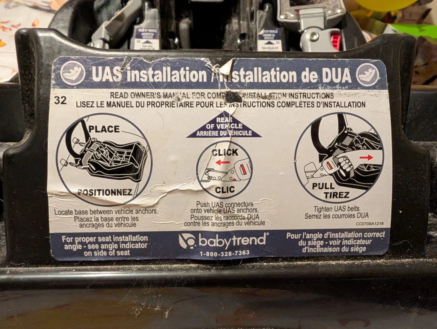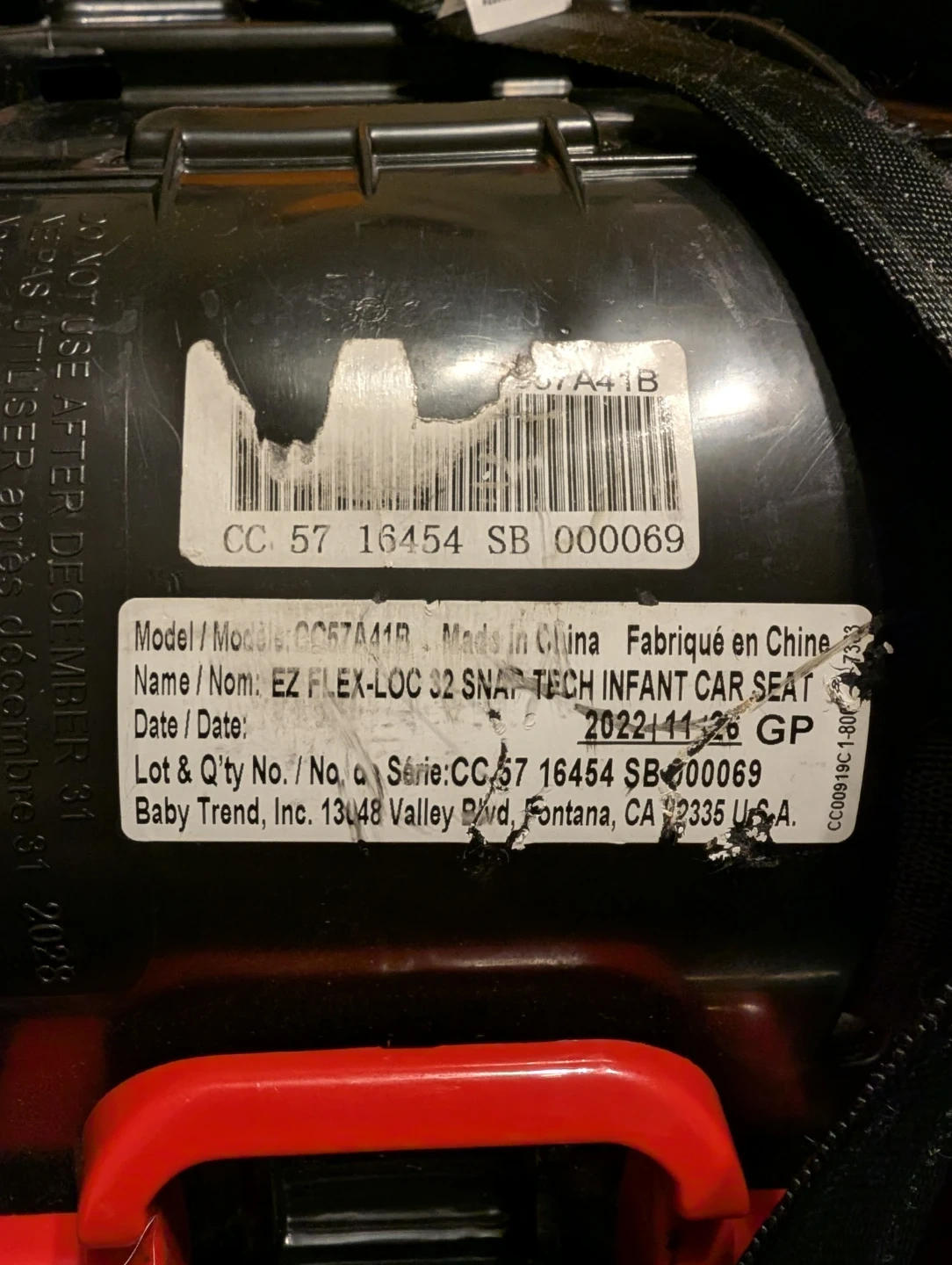 This is a Baby Trend EZ Flex-Loc 32 Snap Tech infant car seat base. Made in China. Model CC67A41R. Date of manufacture is 2022 November 26.