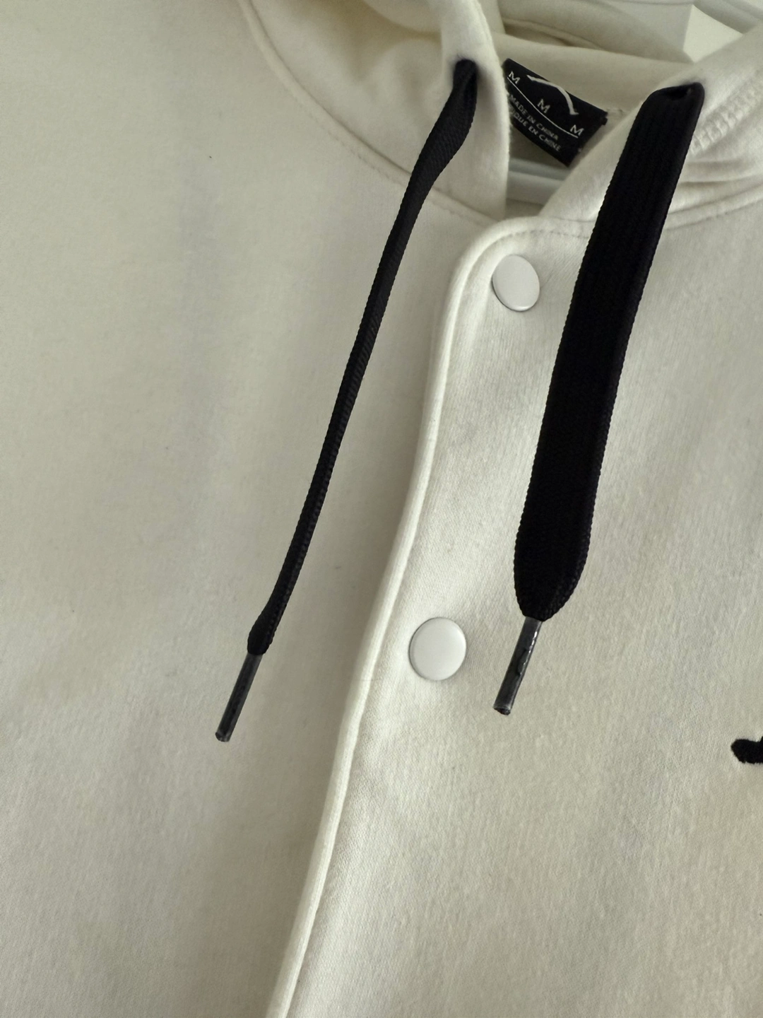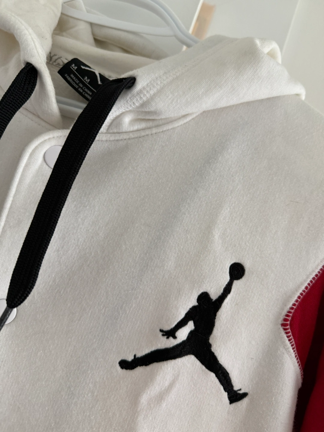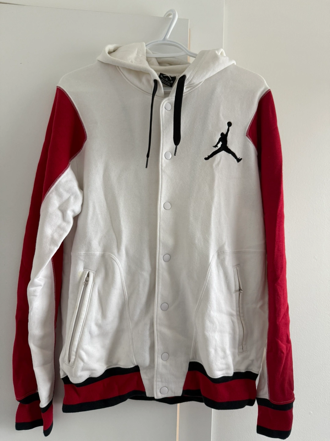 Jordan White and red hoodie with a button closure. Has a black Jordan logo on the front. Size M.