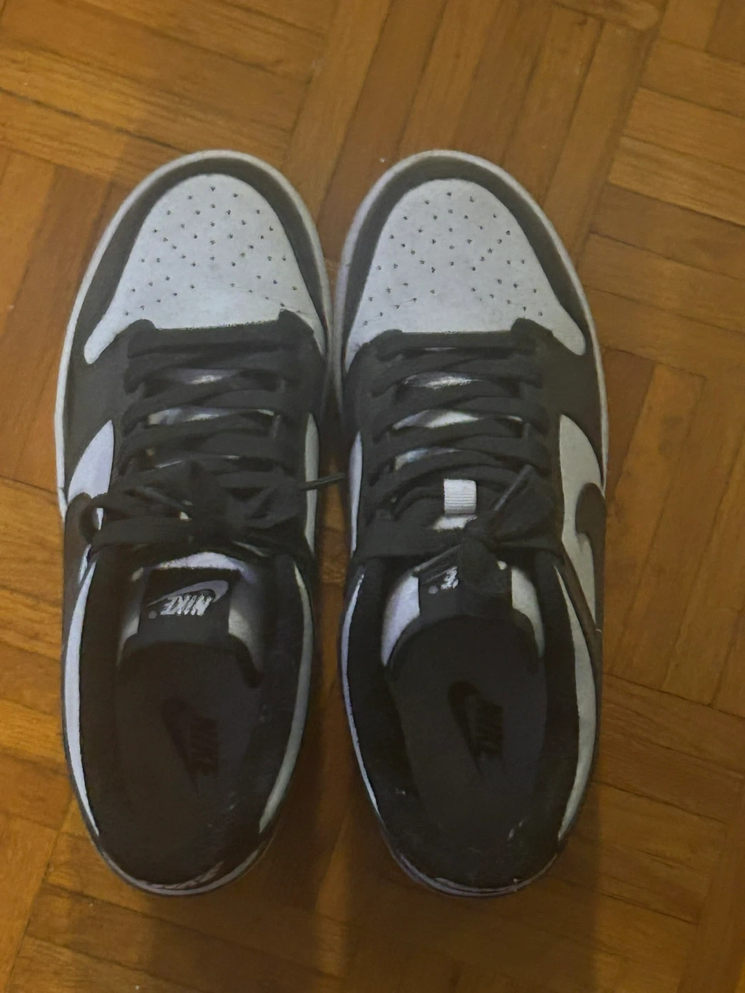 These are a pair of Nike Dunk Low sneakers in black and white. They're a classic low-top silhouette. This style is popular for everyday wear. Only worn twice so basically new