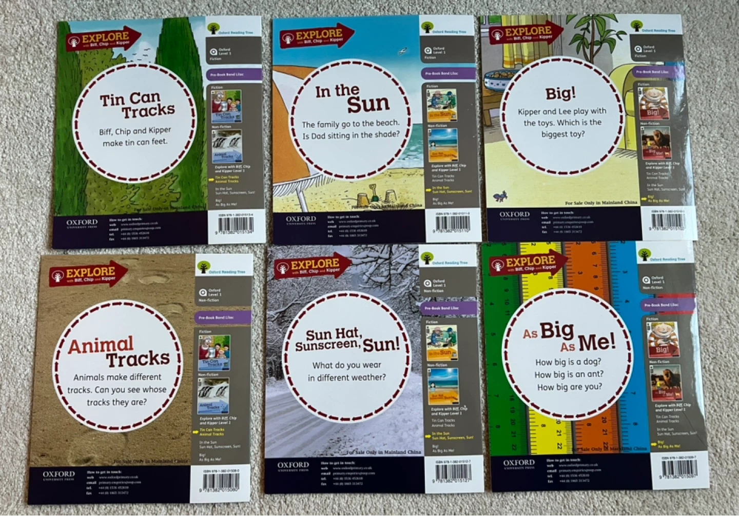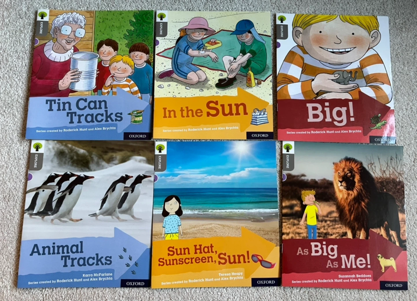 Set of six Oxford Reading Tree Explore books. Titles include Tin Can Tracks, In the Sun, Big!, Animal Tracks, Sun Hat, Sunscreen, Sun!, and As Big As Me!. These books are great for early readers.