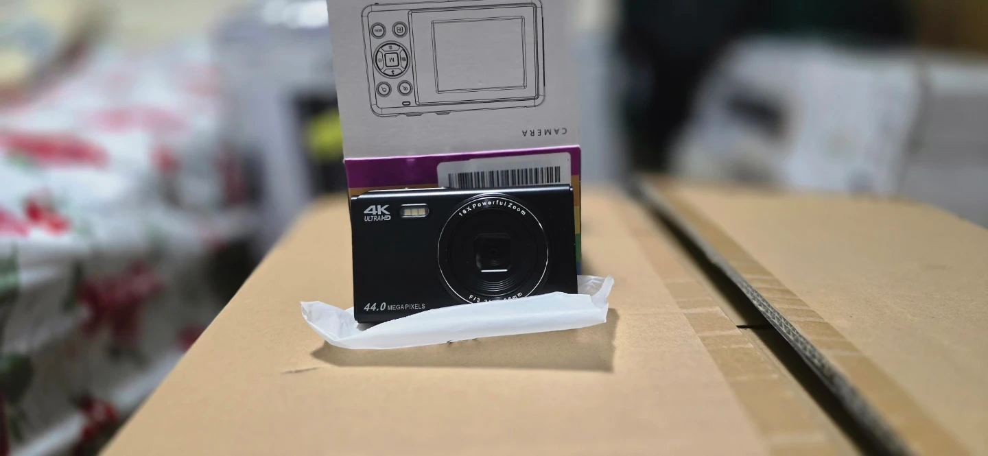 A 4K Ultra HD digital camera with 44.0 megapixels and 10x powerful zoom. It includes a battery and charging cable. Captures clear photos and videos!