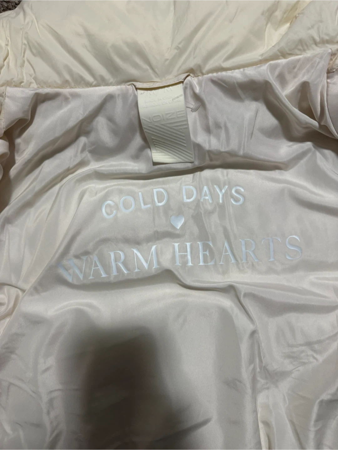 • Inside lining says “COLD DAYS ♥ WARM HEARTS”