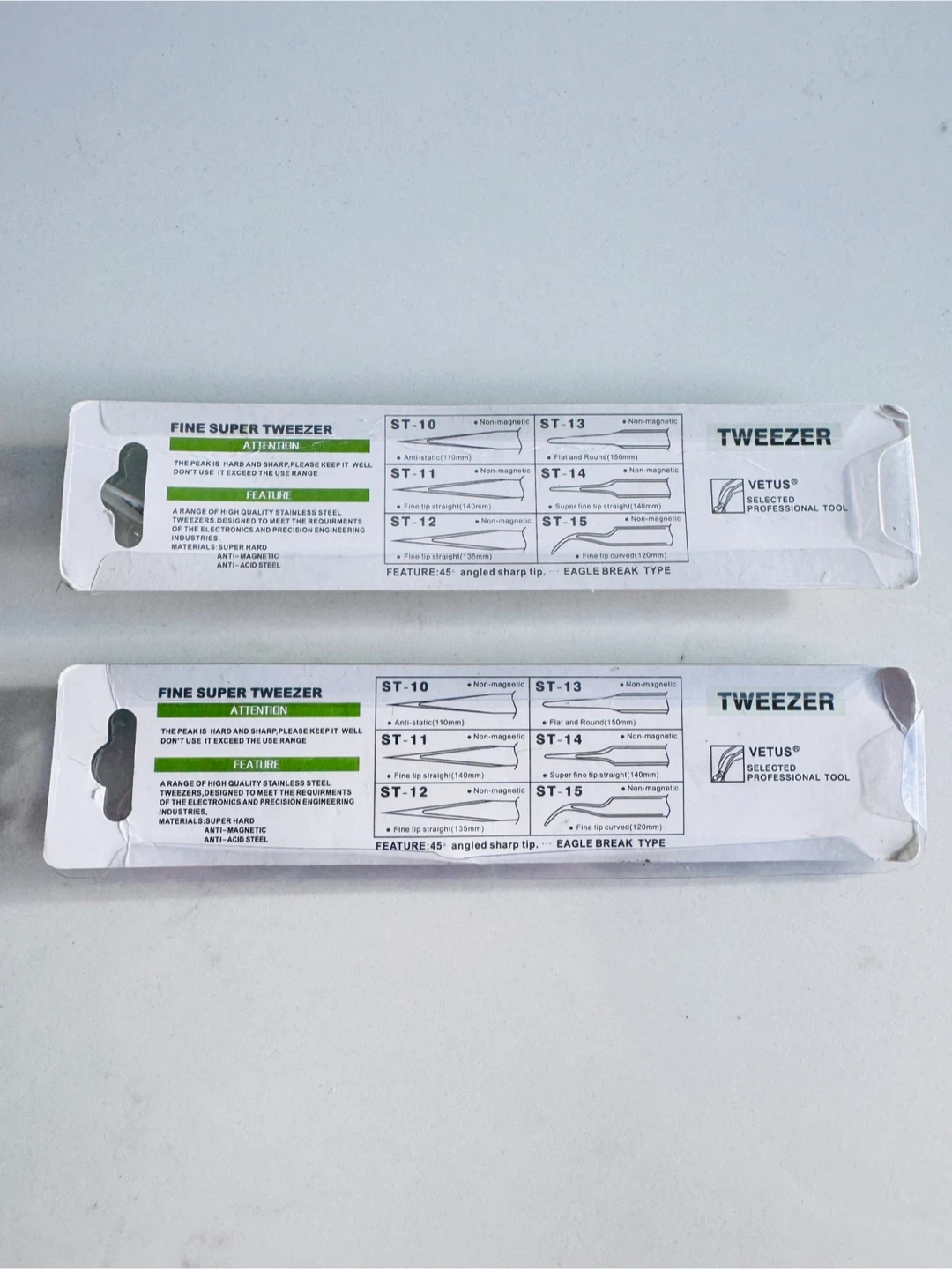 Selling two Vetus fine super tweezers! One is model ST-12 and the other is ESD-15. These are anti-magnetic and anti-acid steel, perfect for electronics and precision work.