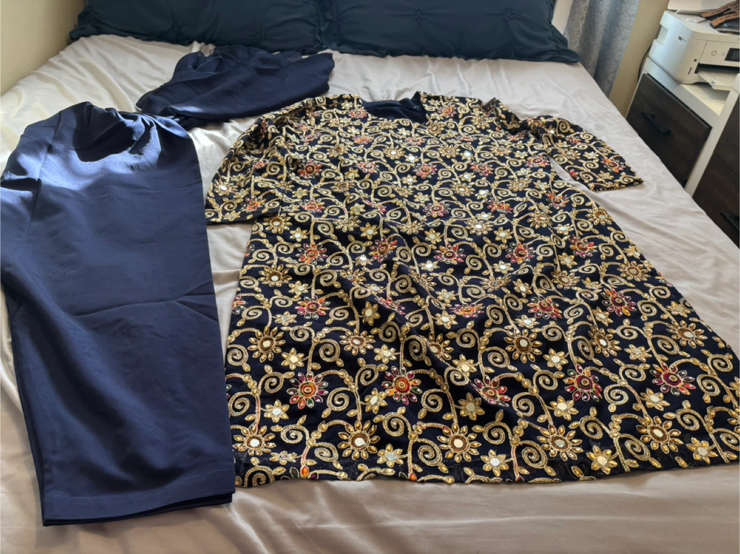 Beautiful floral embroidered dress and pants set in navy blue. Perfect for a special occasion or a stylish everyday look. In great condition!
