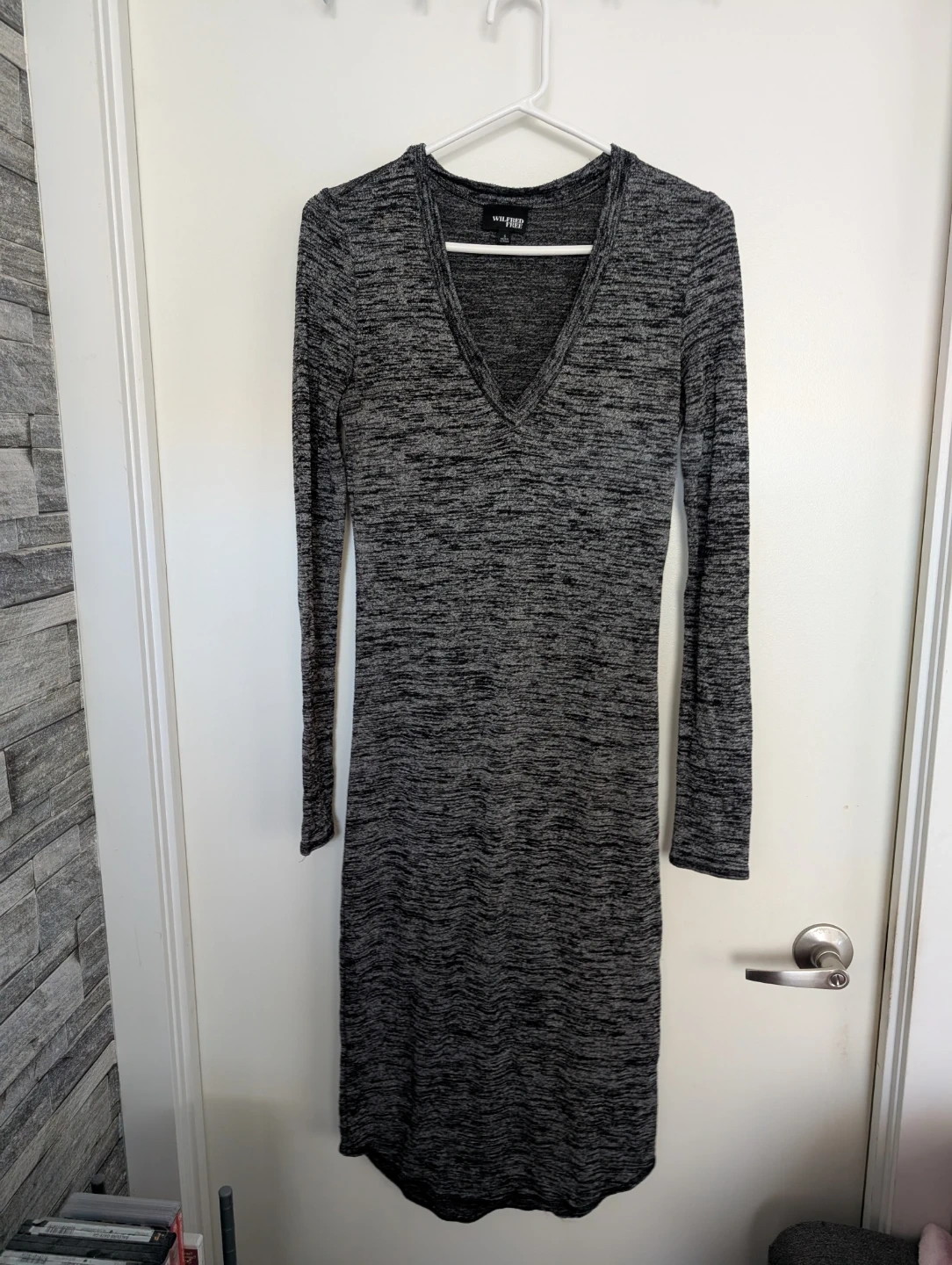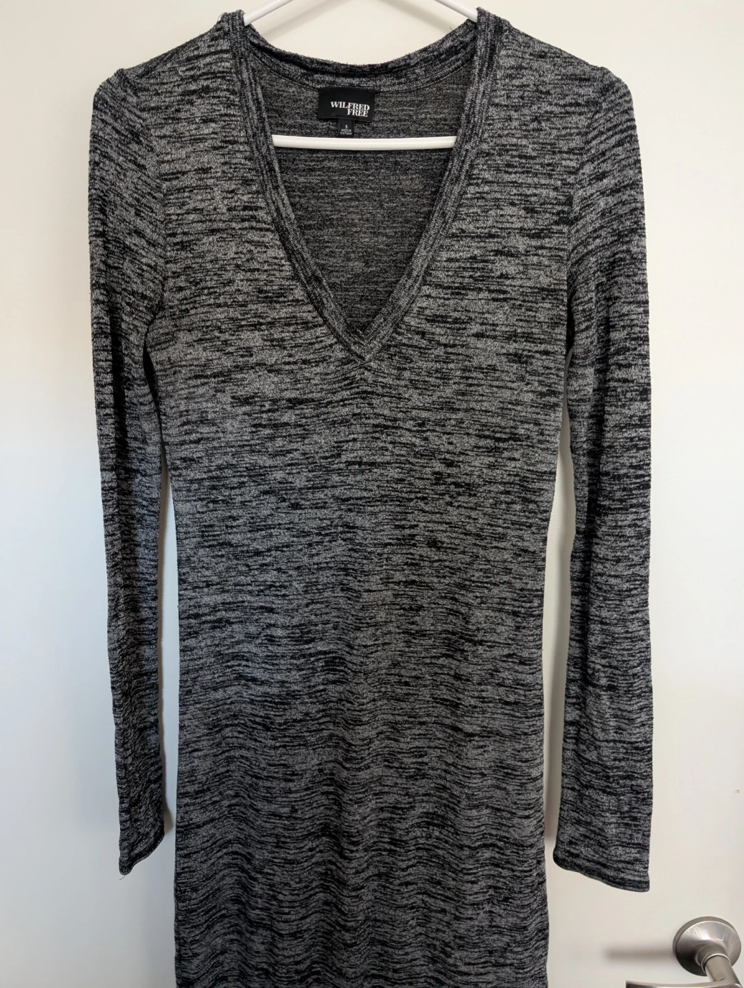 This gorgeous Wilfred Free dress features a marled grey knit with a V-neck and long sleeves. It's a fitted midi-length style. Great for layering or wearing on its own! Super soft and lightweight fabric.