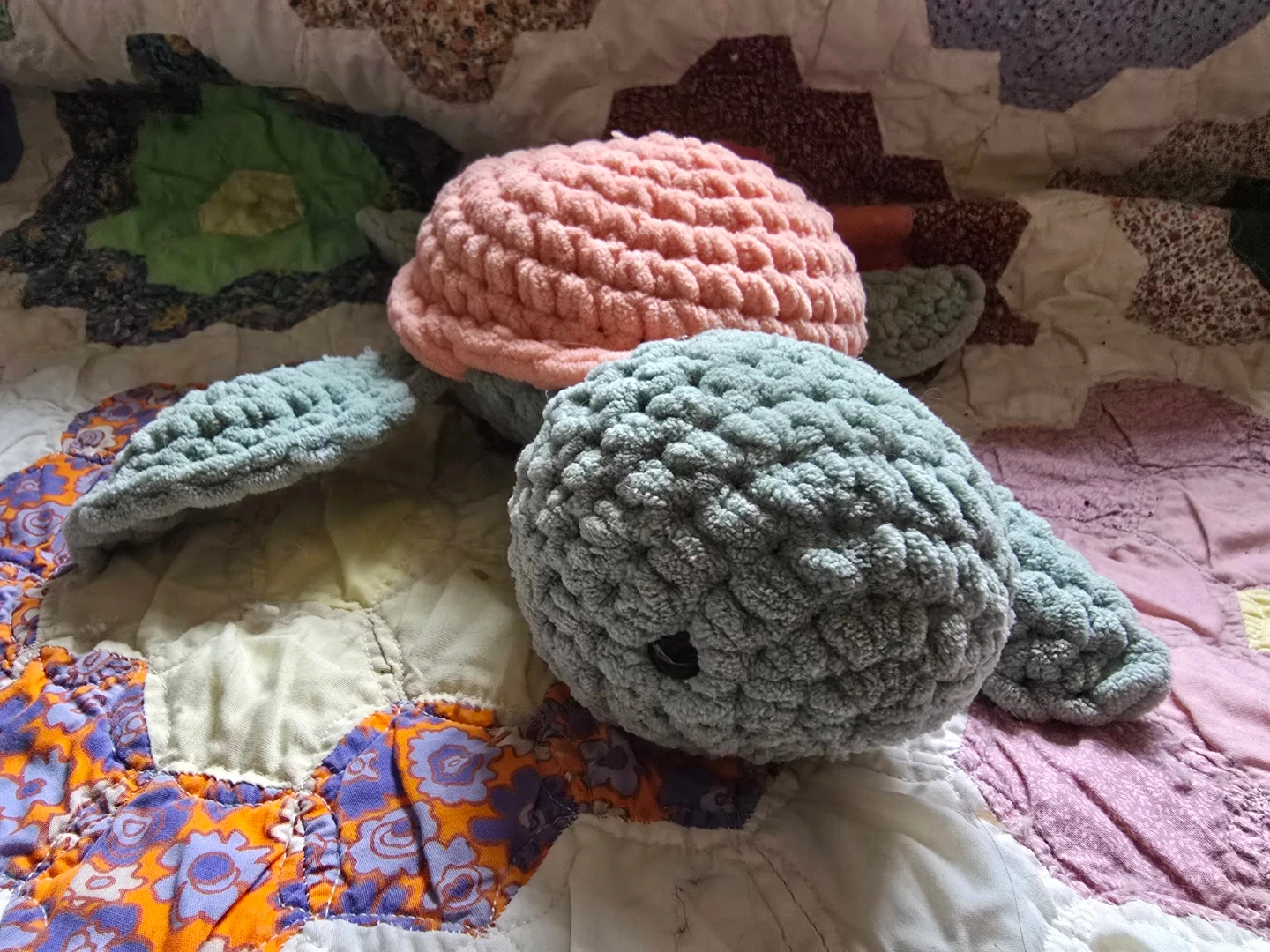 Crochet pink and green turtle plushie/stuffie. Handmade (not by me)