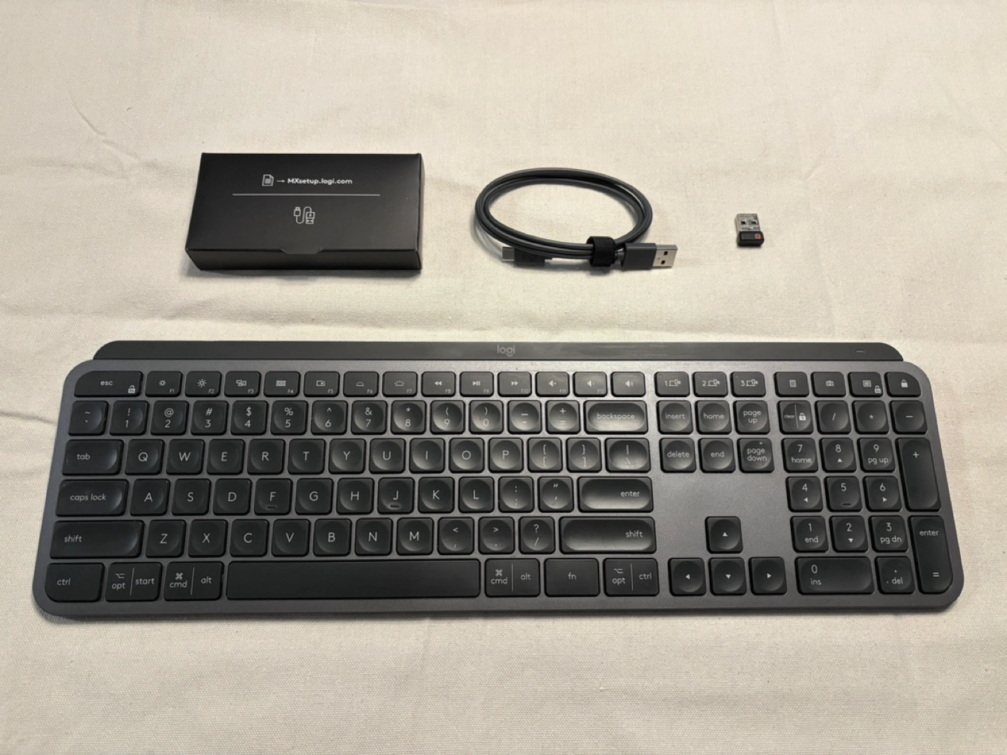 Logitech MX Keys with the charging cable and usb receiver.