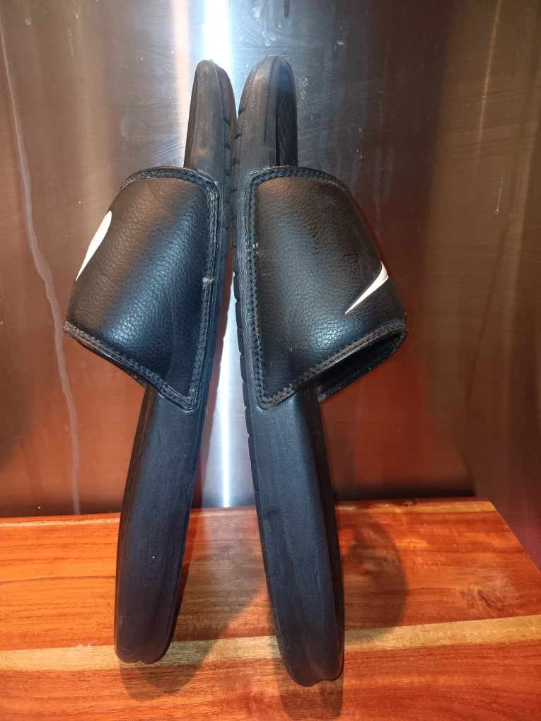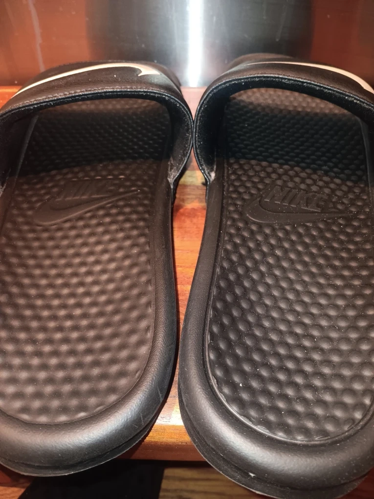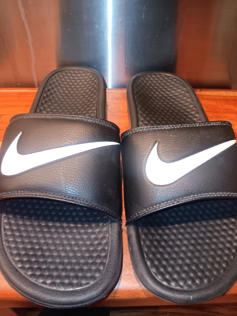 These are black Nike slide sandals. They feature the iconic Nike swoosh logo on the strap. The soles have a textured grip pattern. Perfect for casual wear or after sports!