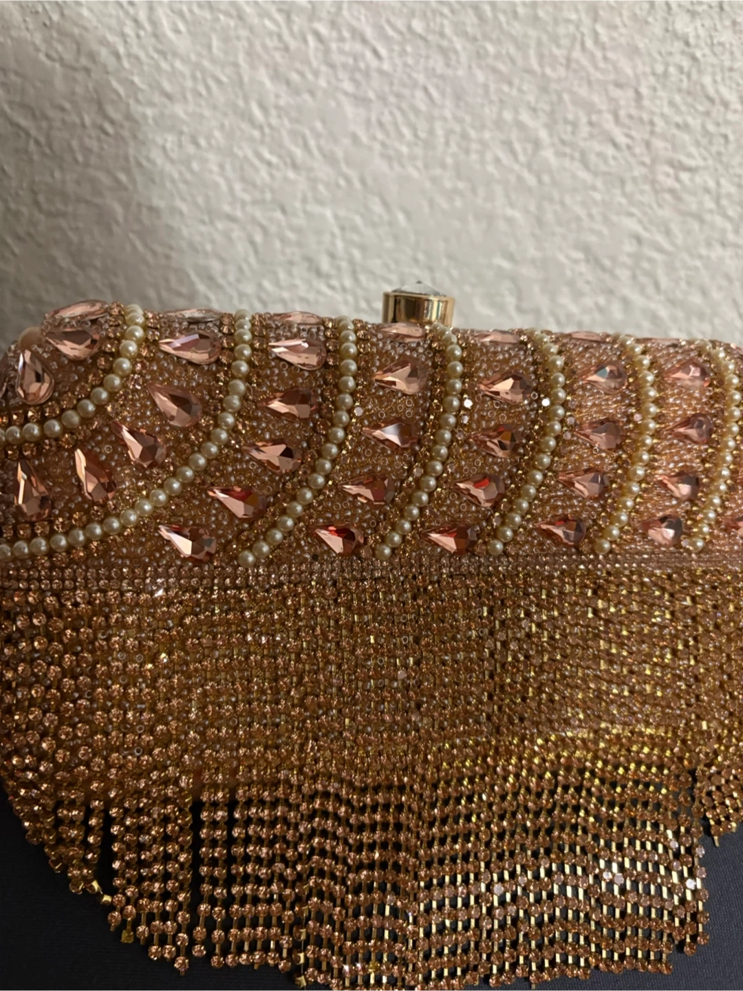 This is a beautiful beaded clutch adorned with faux pearls and rhinestones. It features a stunning fringe detail that adds glamour. It's perfect for special occasions and evenings out!