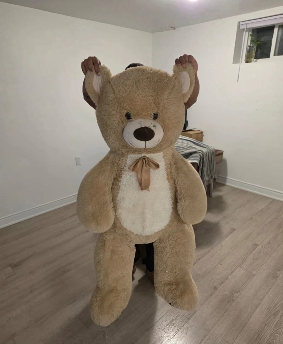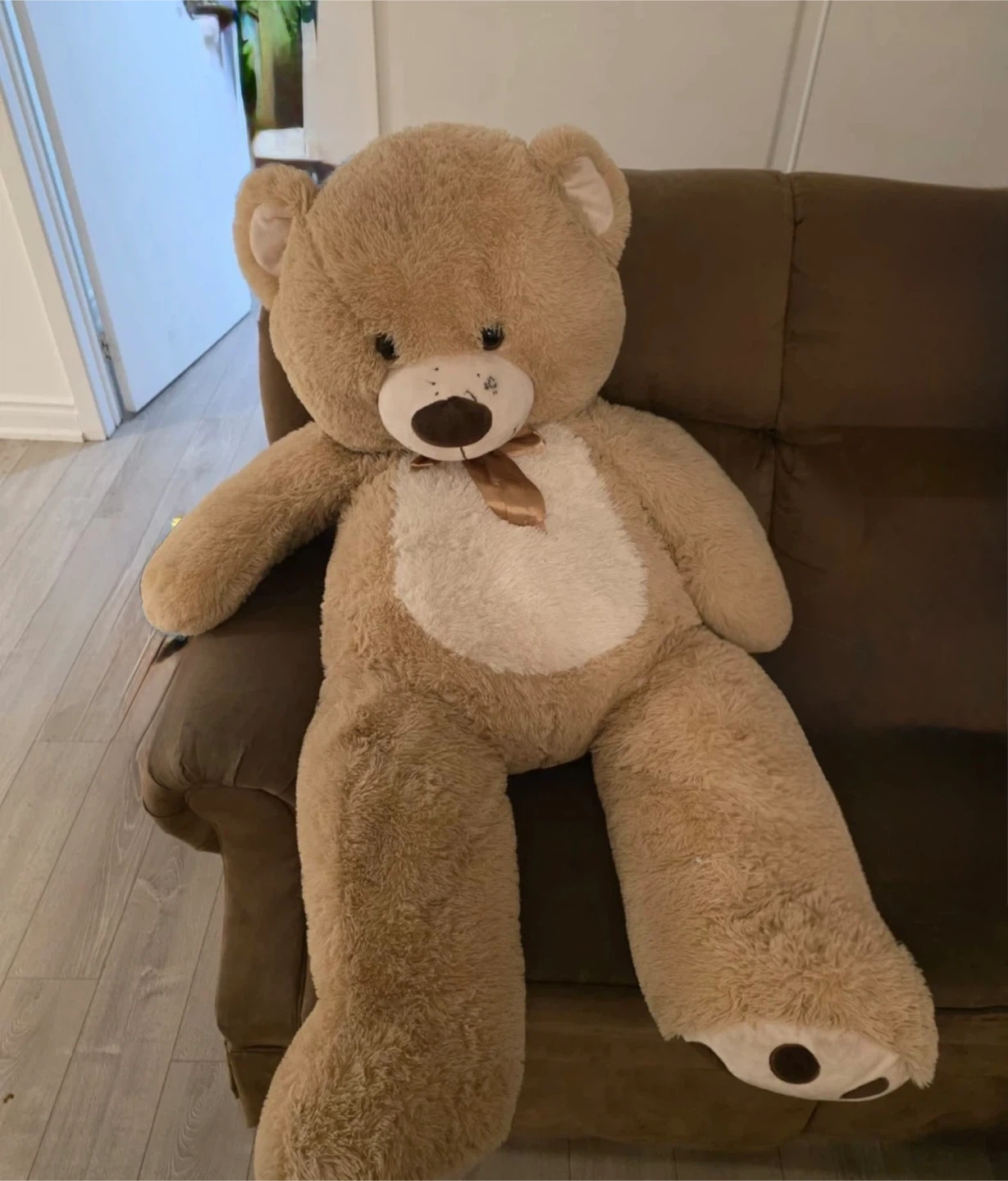 This is a large, light brown teddy bear with a cream-coloured belly and a satin ribbon bow. It's very cuddly and would make a great companion. It's soft plush material. DM for more details.