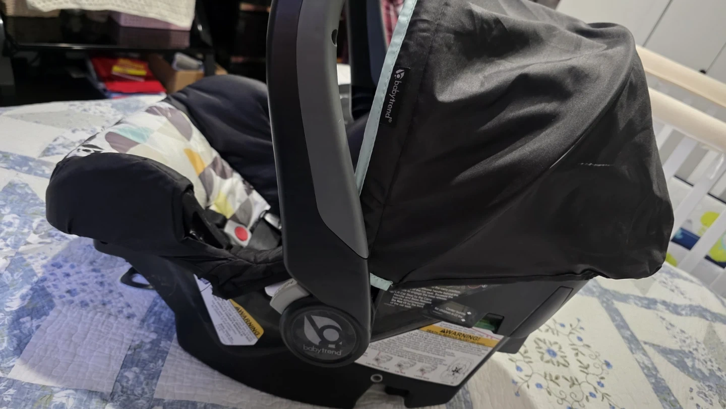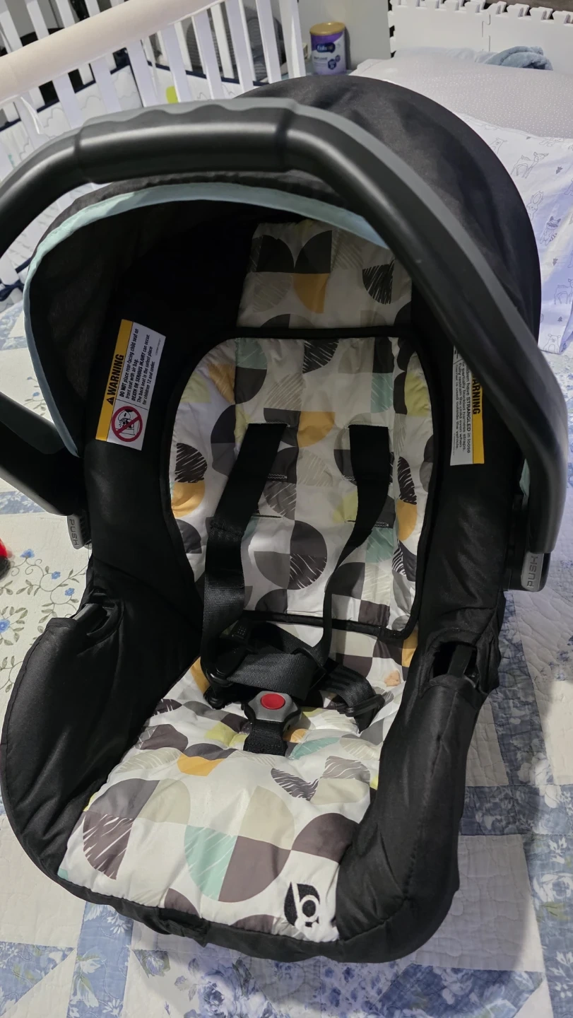 This is a Baby Trend infant car seat. It features a comfortable patterned insert and a black exterior. It includes a 5-point harness system for safety. Suitable for infants.