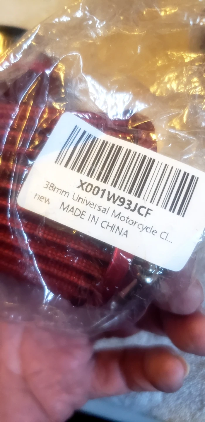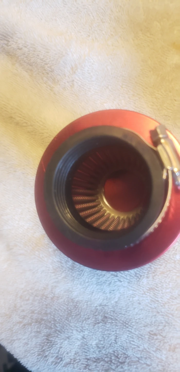 Four red universal motorcycle air filters, each with a 38mm opening and a metal clamp. These are designed for motorcycles. Made located in Marlborough NE 25$ for all 4..
