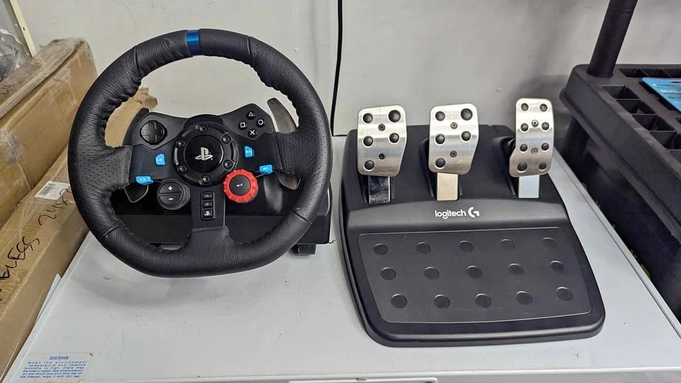 Steering wheel and pedals. Tested on PC and working perfectly. Please note, there are two small slices on the steering wheel as shown in the last photos. This does not affect its use, but I wanted to make sure you can see the condition before pickup. The product states compatibility with PlayStation, PC, and Xbox.