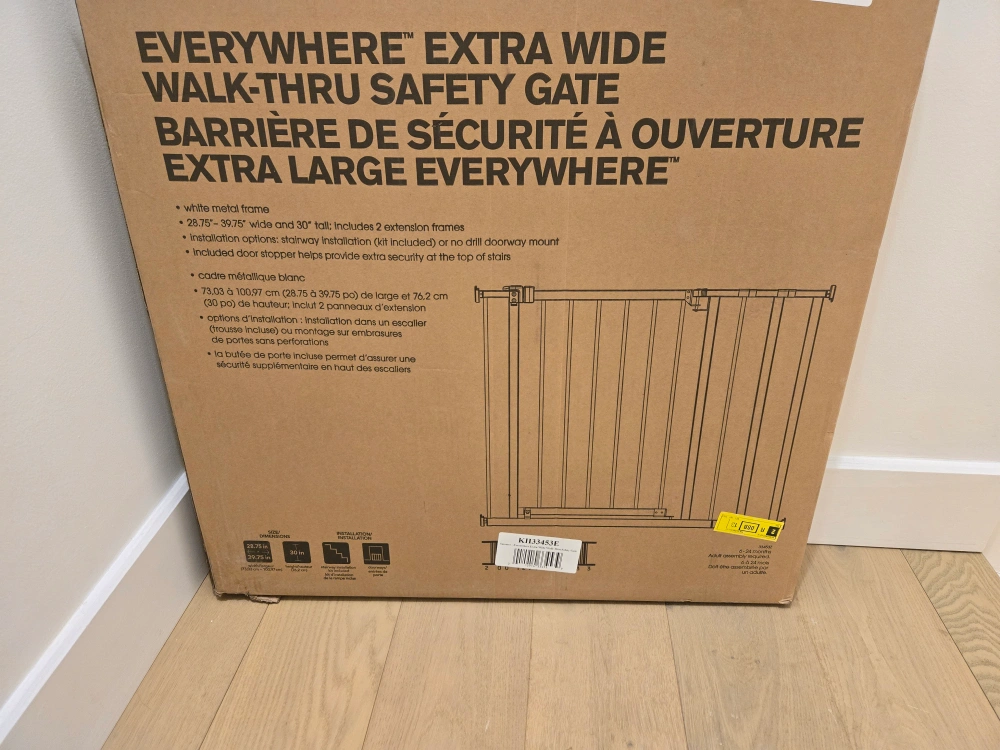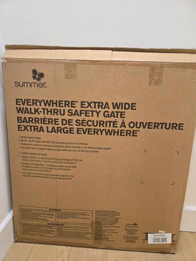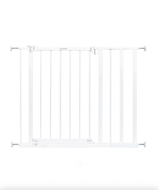 Specially designed to span extra-wide openings, the Summer Everywhere Extra Wide Walk-Thru Safety Gate in White is secure, convenient to use, and can be customized to fit your space. This 30” tall baby and dog gate fits openings 28.75 to 39.75” wide and can be installed in doorways or hallways using the no-drill pressure mount system with adhesive wall cups. Hardware is included for a secure installation at the top of stairs. It’s easy to operate this gate with one hand. The door stopper helps prevent the door from swinging outward over stairs. Package includes hardware installation kit.
