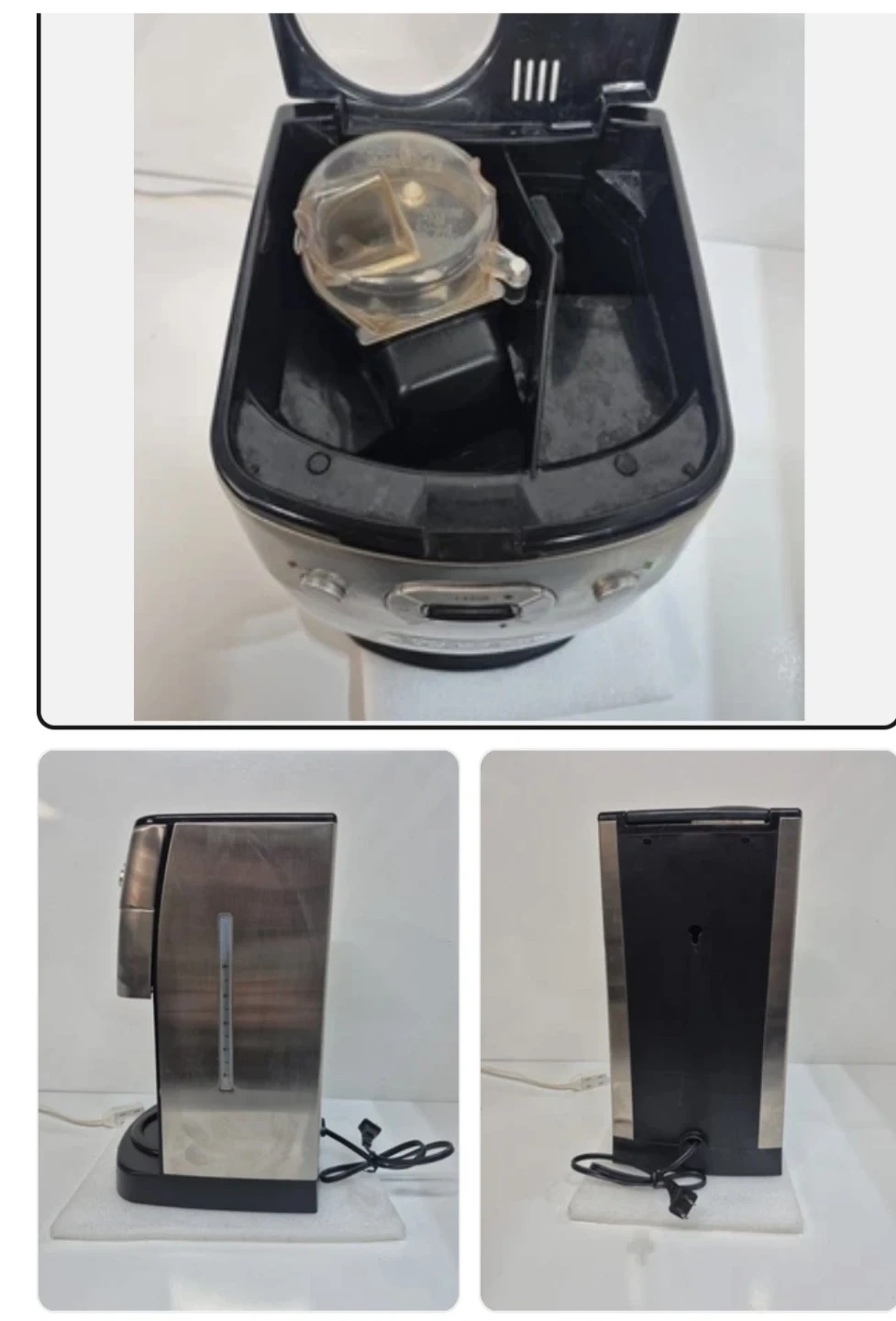 This Cuisinart coffee maker features a brushed stainless steel exterior and a thermal carafe. It's designed for brewing coffee at home. The machine has a digital display and programmable settings.