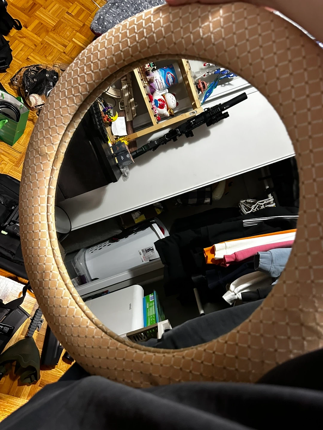 This is a round decorative wall mirror with a tan textured frame. It has a textured diamond pattern and a wire for hanging. It's a nice accent piece for any room!