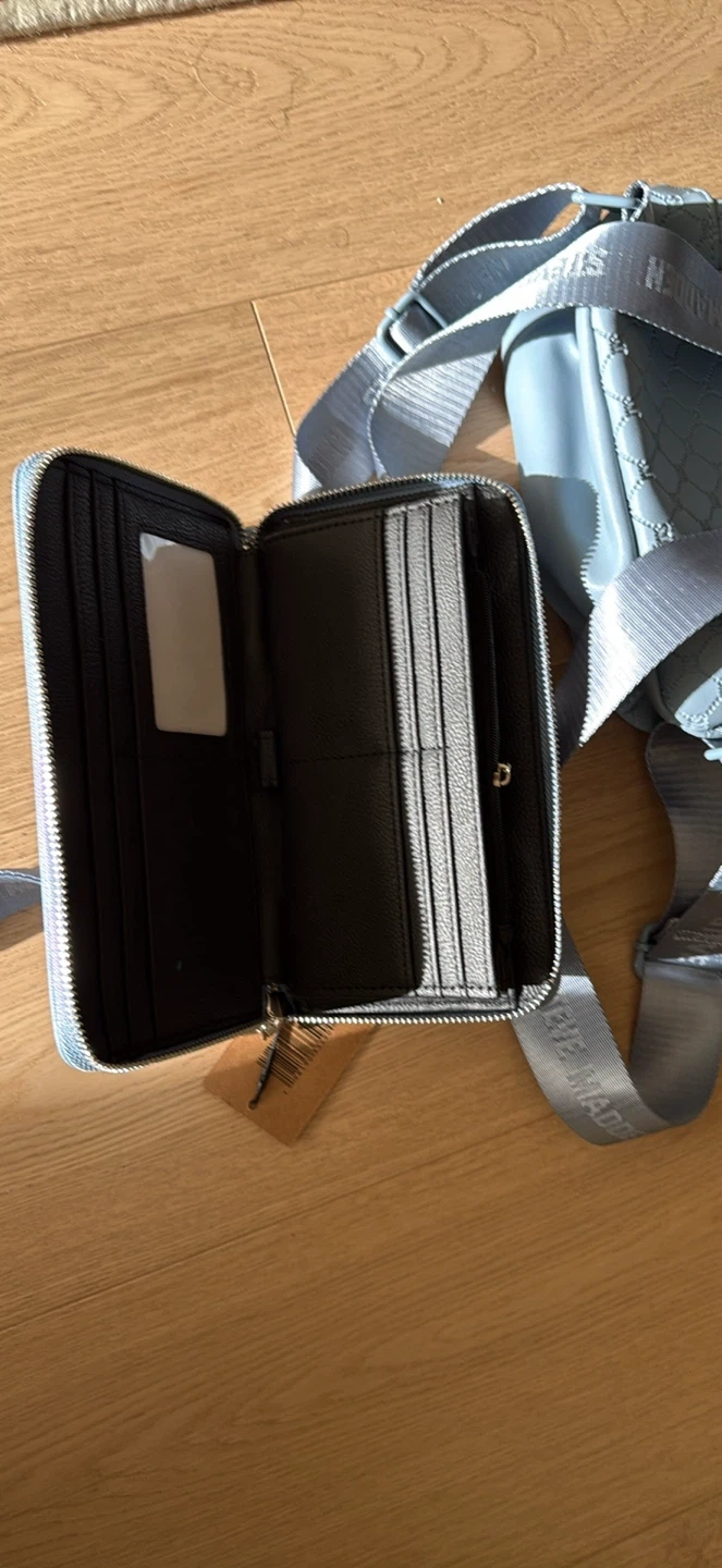 Light blue faux leather mini backpack and matching zip-around wallet set. The backpack features quilted stitching and adjustable straps with 'Steve Madden' branding. The wallet has multiple card slots and a zippered coin pocket.