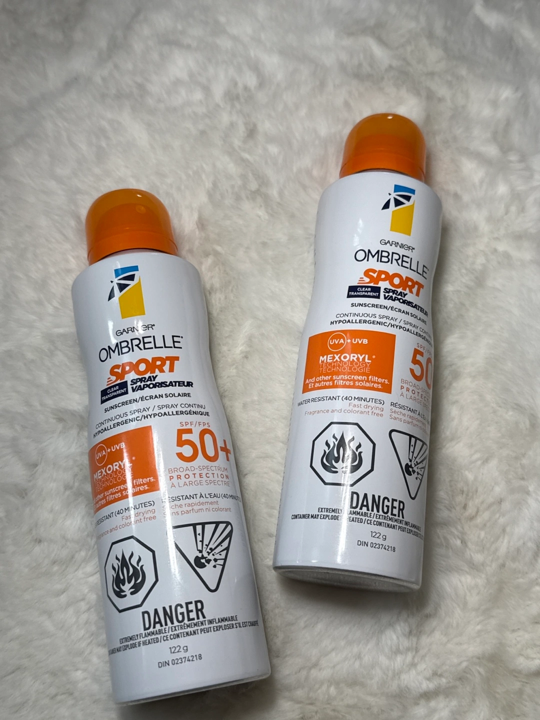 Two bottles of sunscreen. They appear to be spray bottles. The bottles are white with an orange cap. Taking care of your skin is important, and these are perfect for a day outside. $10 each ❤️