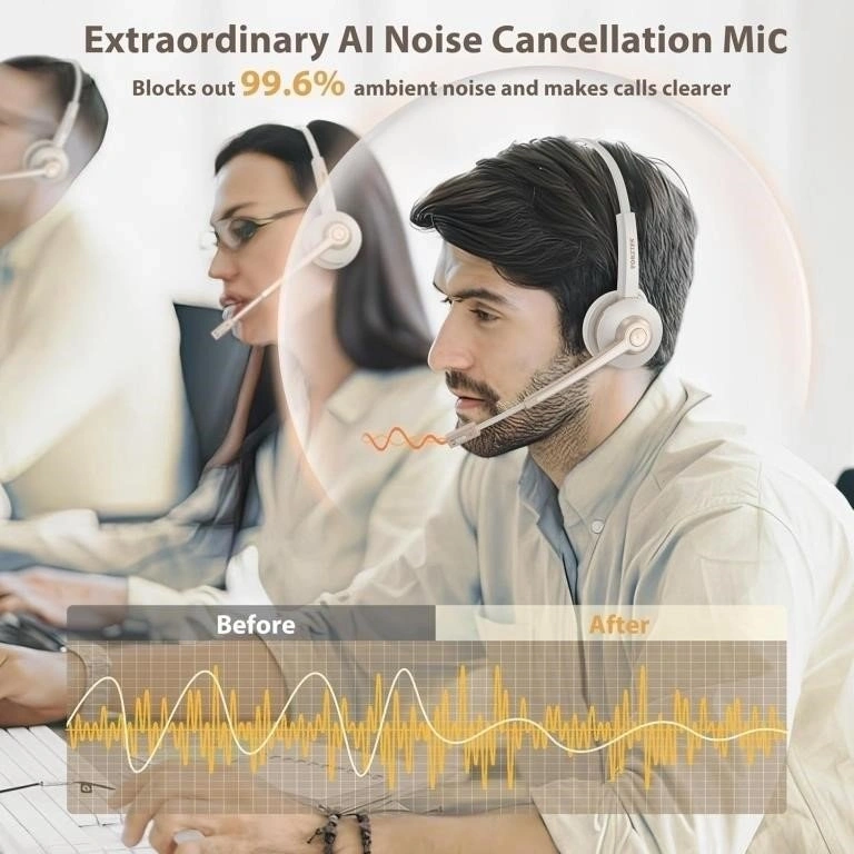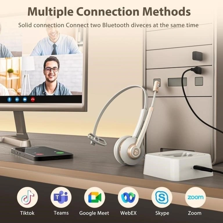 Wireless headset V5.2 with AI noise canceling mic and USB dongle. Includes charging base and mute function. Great for computer, phone, or office use.